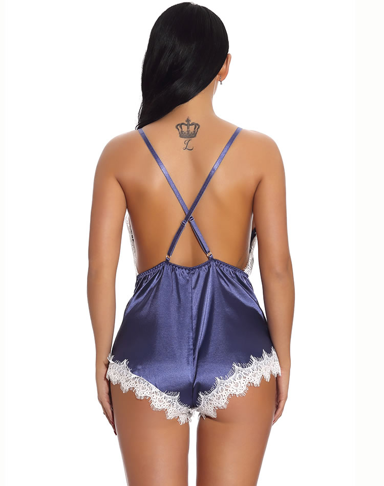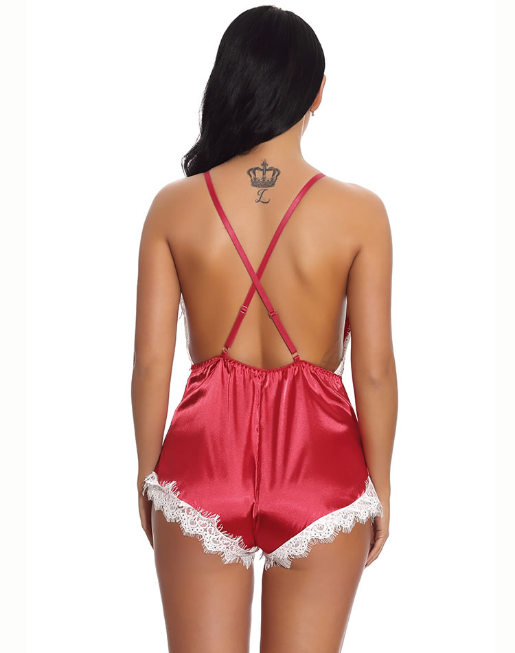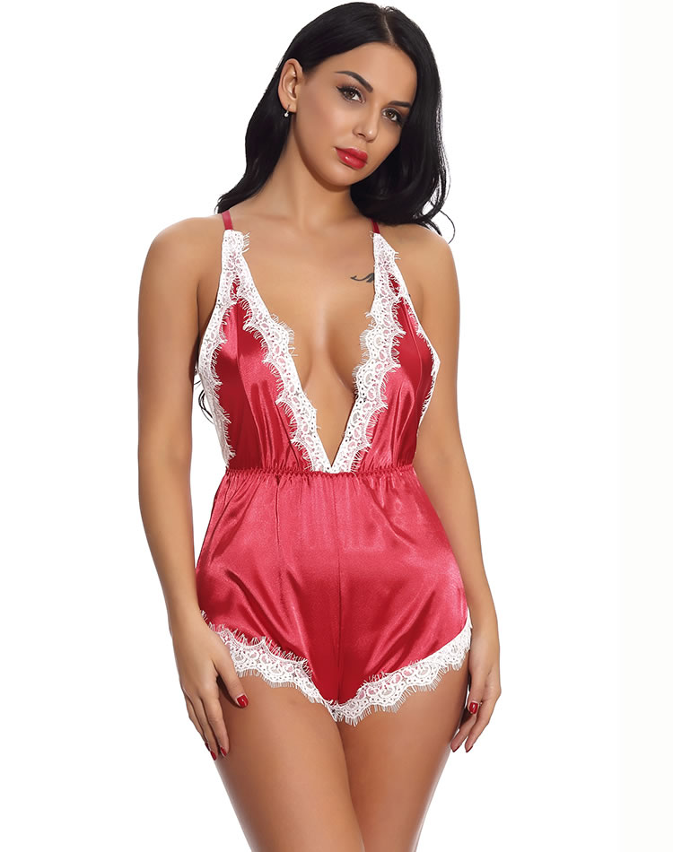 Tempt and tease in this elegant satin teddy featuring satin cups, a plunging V-neckline with a scalloped lace trim, criss-cross spaghetti straps, a satin bodice, and a lace hem.