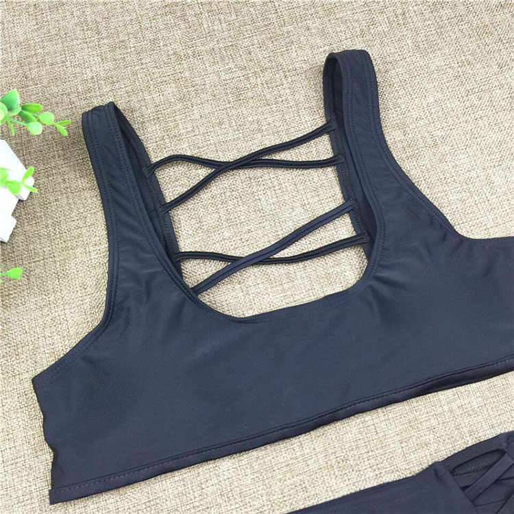 Hit the beach in this exclusive bikini set featuring a scoop neckline, thick shoulder straps, a criss-cross strappy open back with a tie back closure, and a matching bottom with criss-cross strappy sides, and a cheeky cut back.