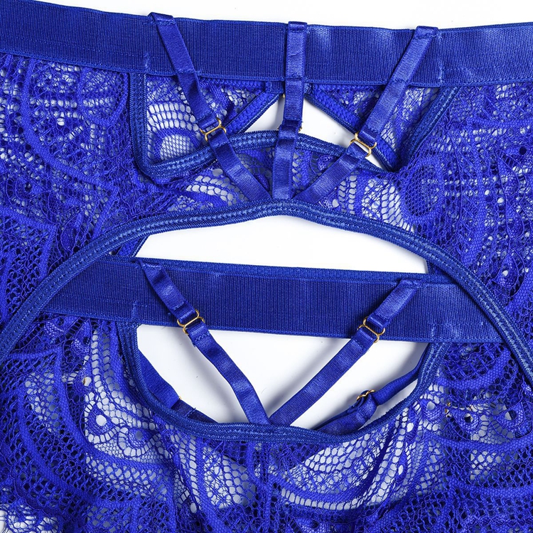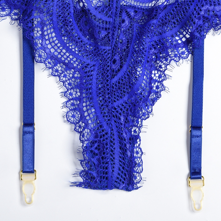 Show your honey all you have to offer in this ultra sexy bra set featuring eyelash lace underwire cups, adjustable spaghetti straps, a front keyhole opening, a hook and eye back closure, a matching garter belt with adjustable garter straps, a hook back closure, and a matching panty with a thong cut back.