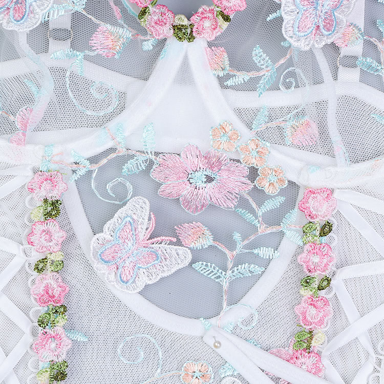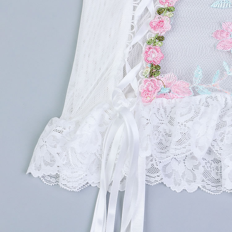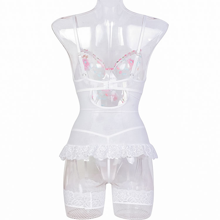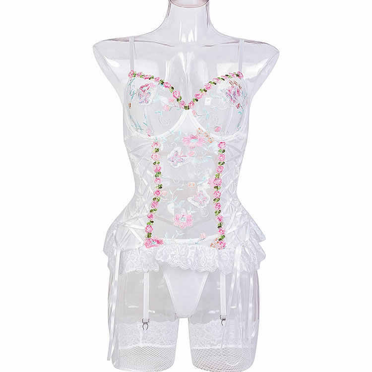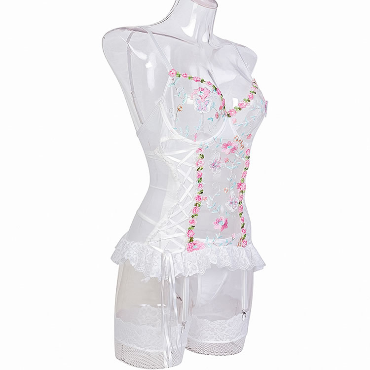 Your sex life will blossom in this exquisite bustier set featuring sheer mesh underwire cups with floral embroidery, adjustable spaghetti straps, a sheer mesh bodice with an embroidered center panel, a hook and eye back closure, a lace hem, adjustable garter straps, and a matching thong. (Included Thigh high stockings.)