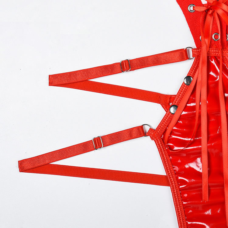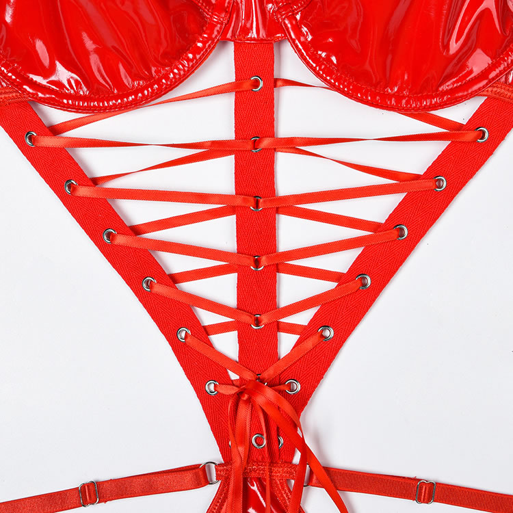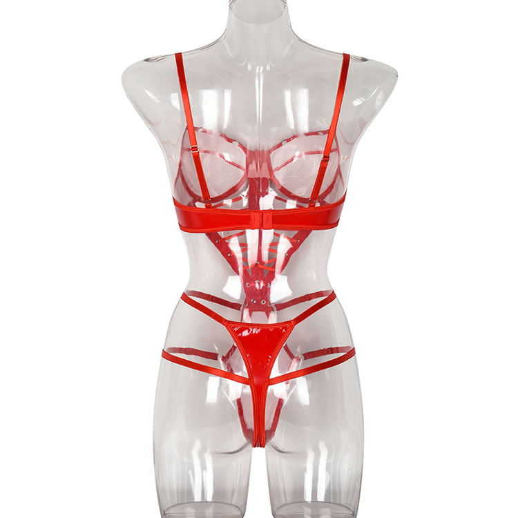 Turn up the heat in this ultra sexy teddy featuring vinyl underwire cups, silver stud accents, adjustable spaghetti straps, a hook and eye back closure, a slim bodice with a thin waistband, open sides and back, and a thong cut back.