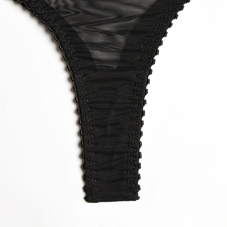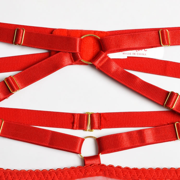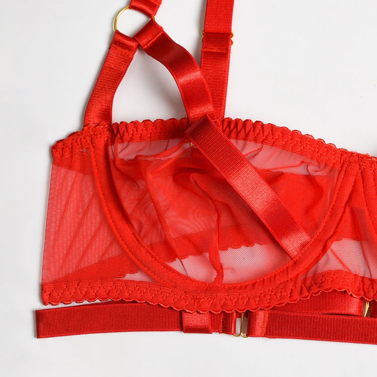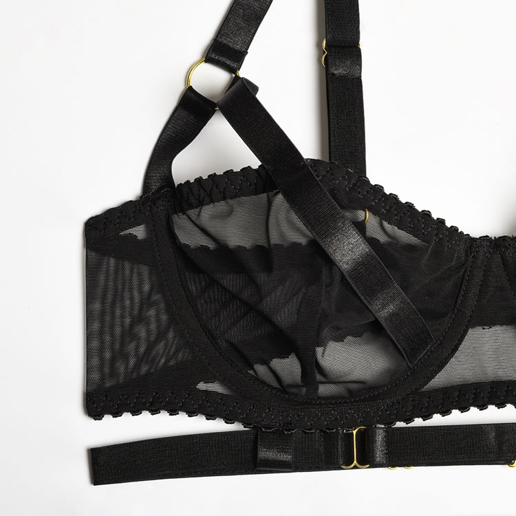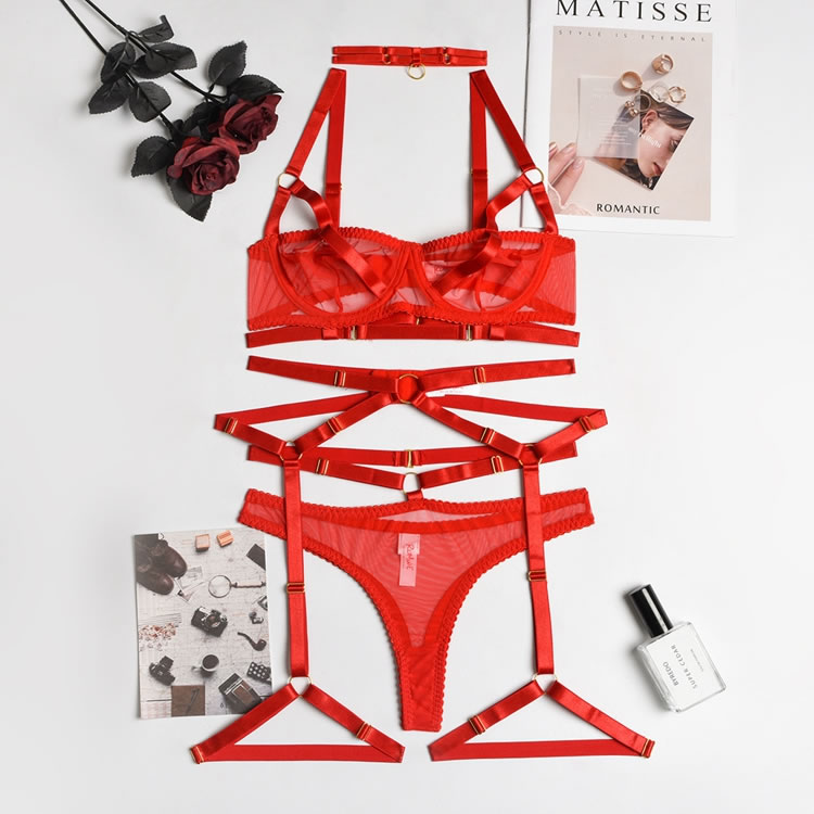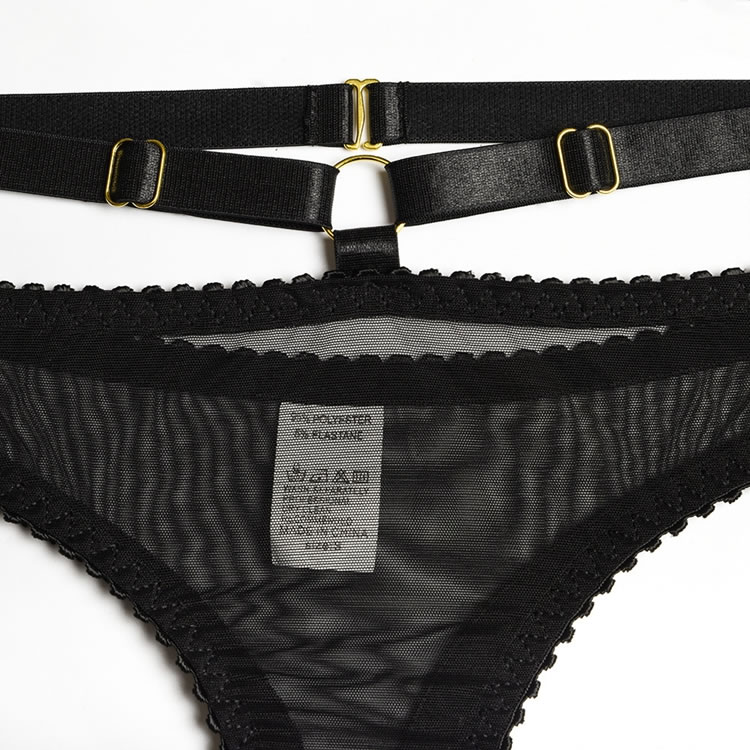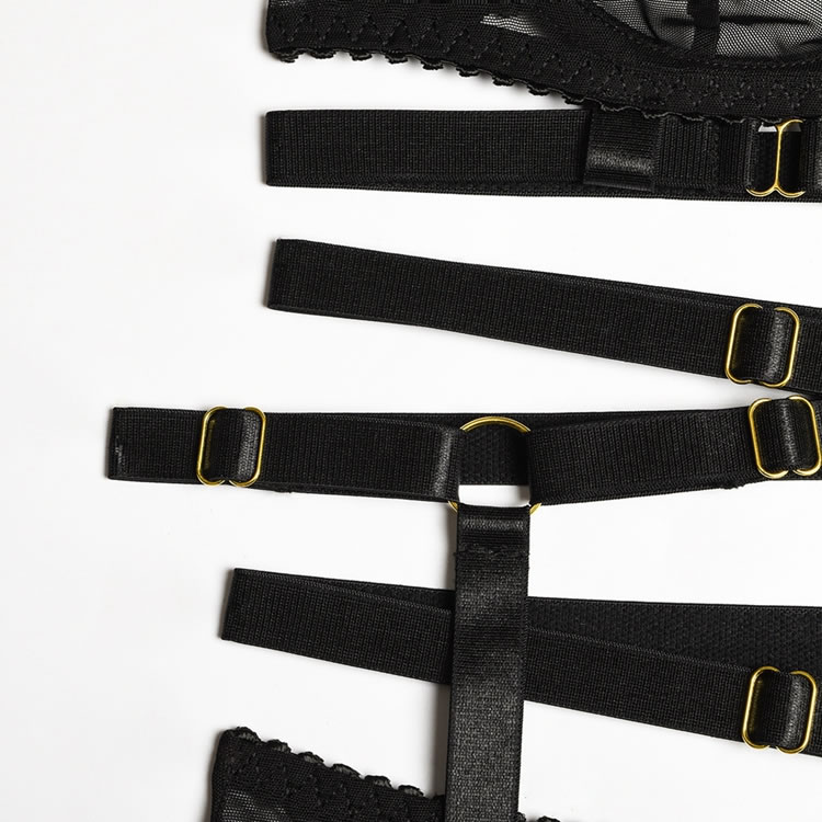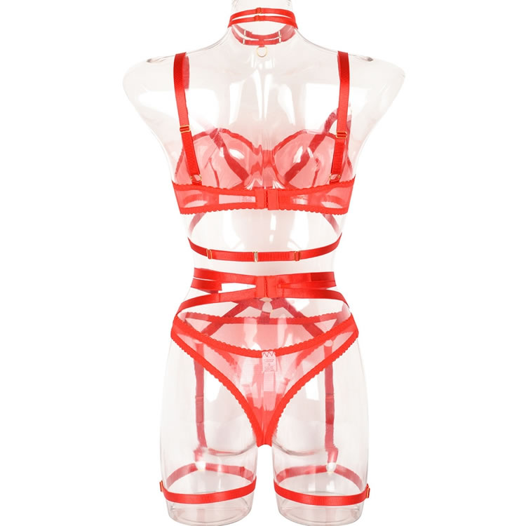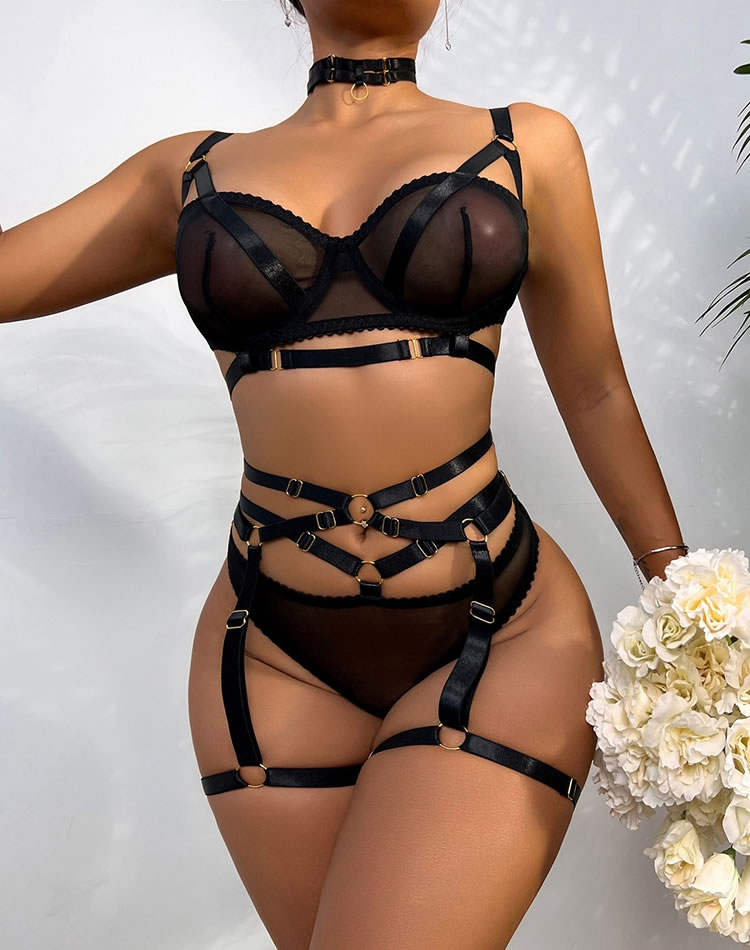 Heart eyes all night long in this sexy bra set featuring sheer underwire mesh cups wtih strappy bust detailing, adjustable spaghetti straps, a strappy underbust band with a hook back closure, a matching garter belt with adjustable garter straps, wraparound leg garters, and a strappy mesh panty.