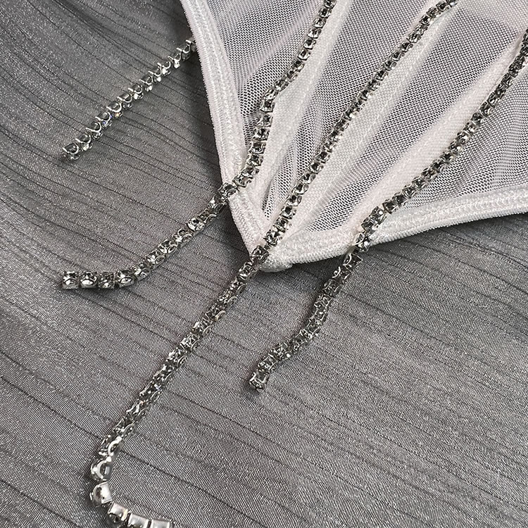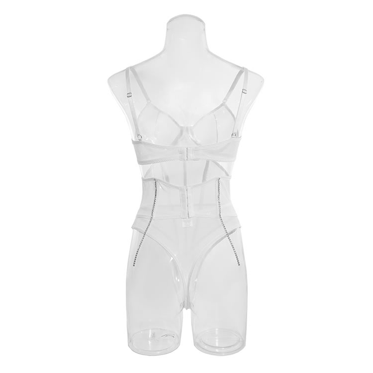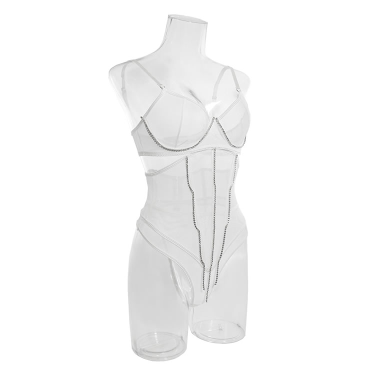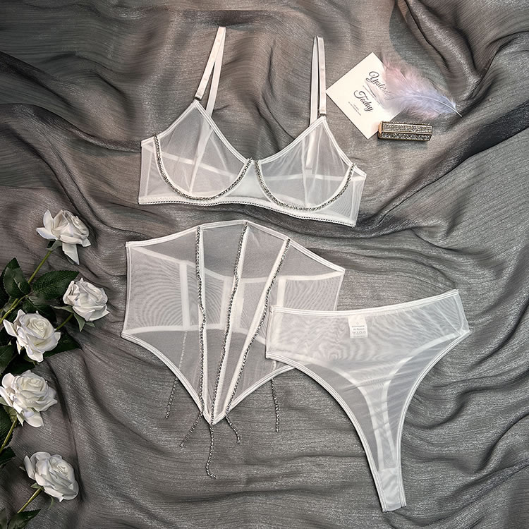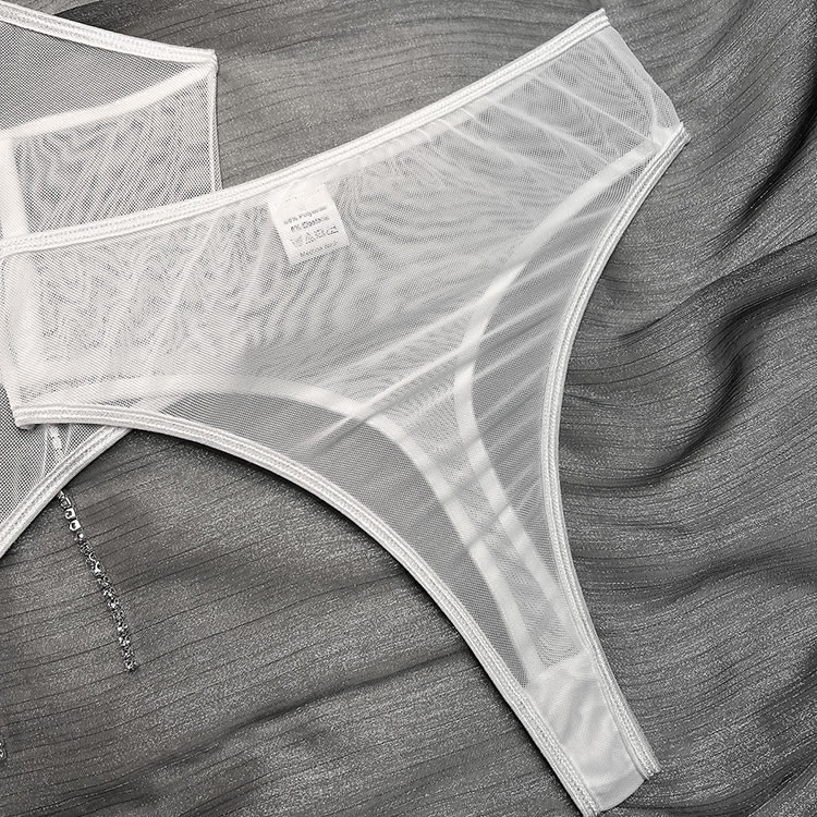 Show them who's in charge! Leave a lasting impression in this seductive bra set featuring underwire sheer mesh cups with a rhinestone trim detailing, adjustable spaghetti straps, a hook and eye back closure, a matching waist cincher with rhinestone accents , a hook and eye back closure, and a matching panty with a cheeky cut back.