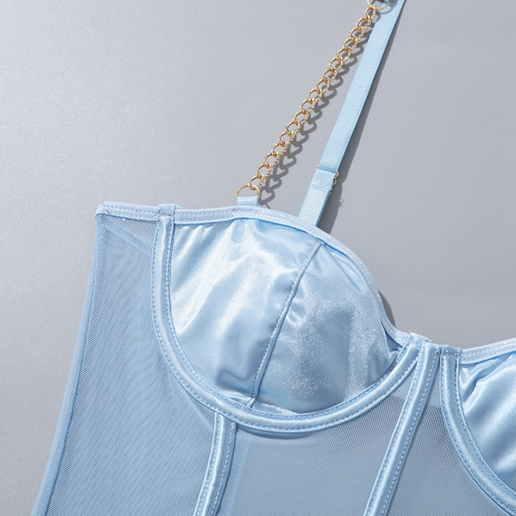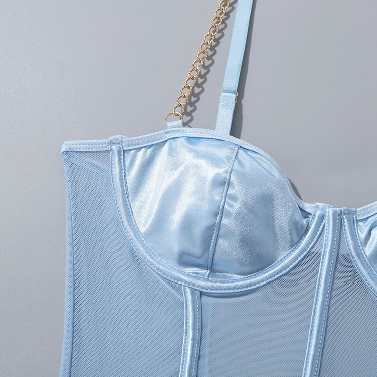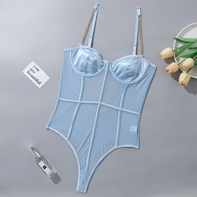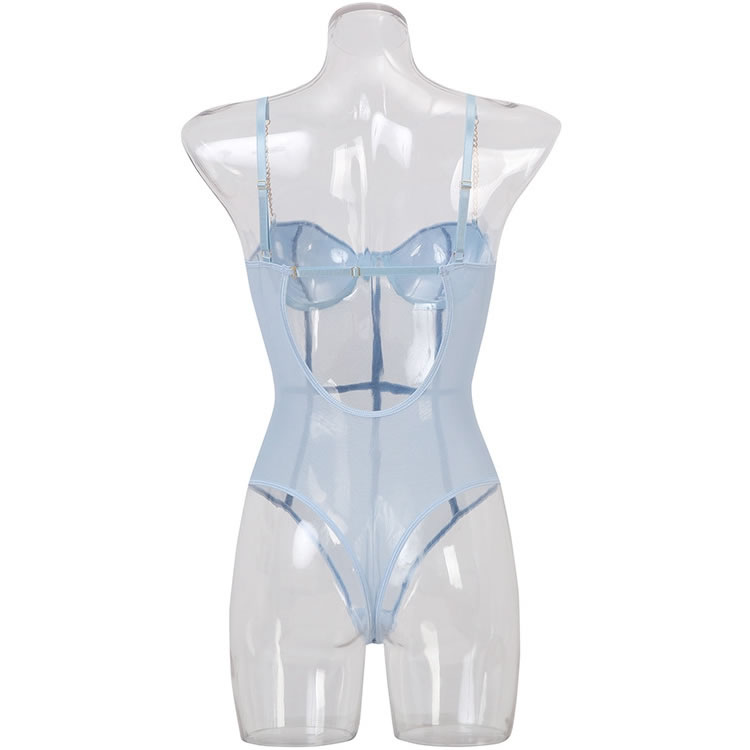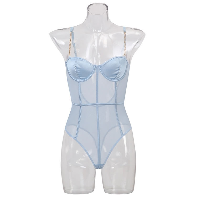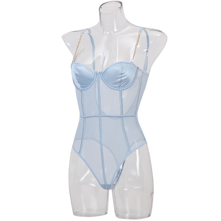 Live the life of luxury in this flirty mesh teddy featuring soft underwire cups, adjustable spaghetti straps with gold chain detailing, a sheer mesh bodice, a hook back closure with a large back keyhole, and a sheer mesh thong cut back.