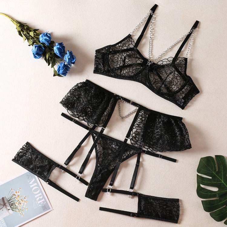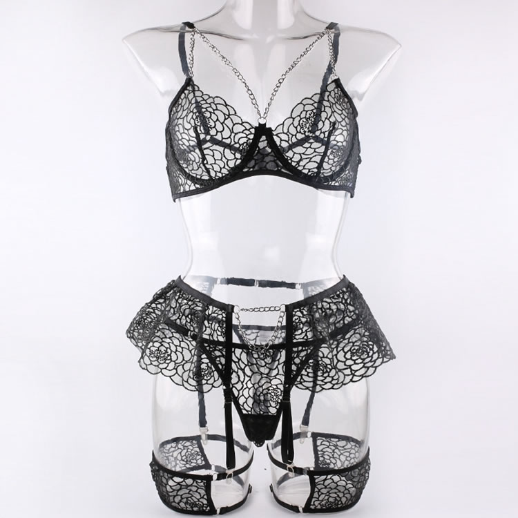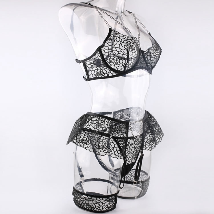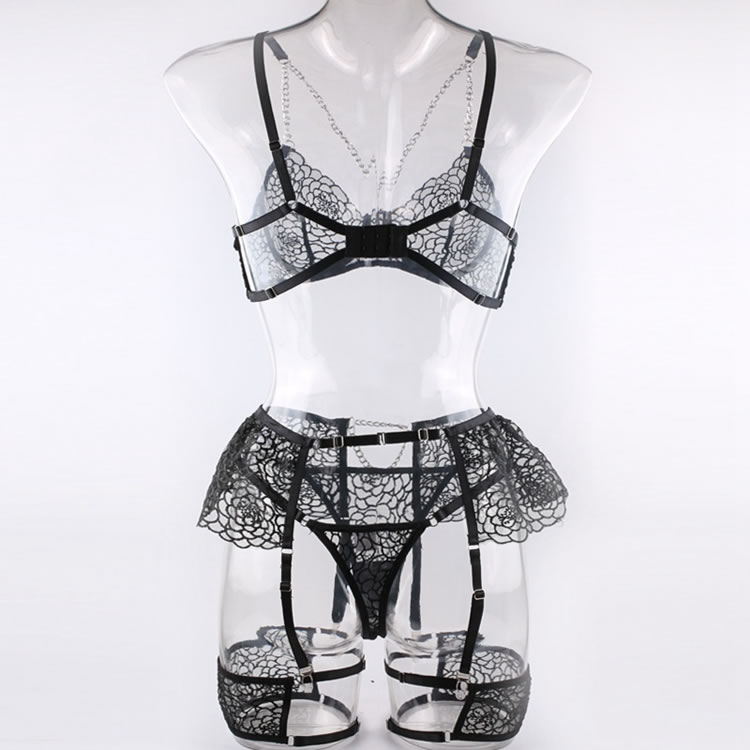 Seduce and amuse in this Exclusive bra set featuring sheer lace underwire cups, adjustable spaghetti straps with link chain detailing, a hook and eye back closure, a matching garter skirt with adjustable garter straps, wraparound leg garters, and a matching panty.