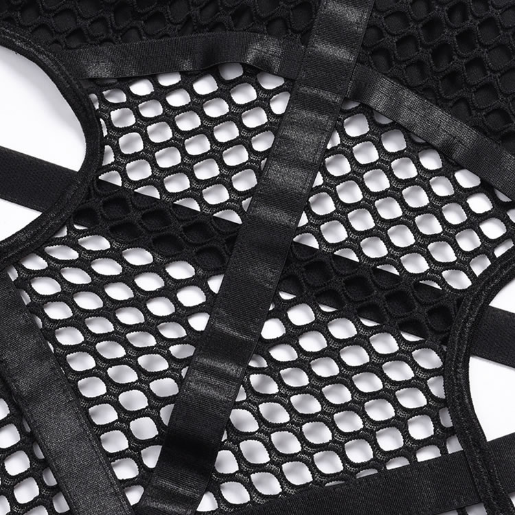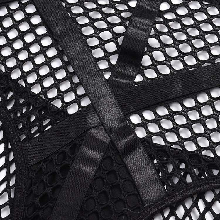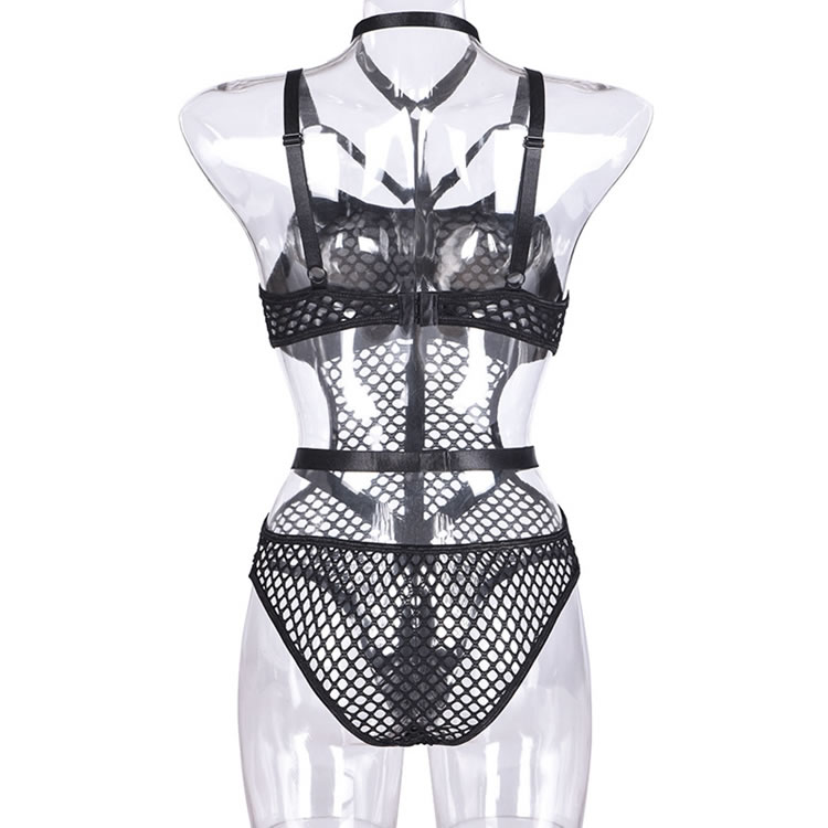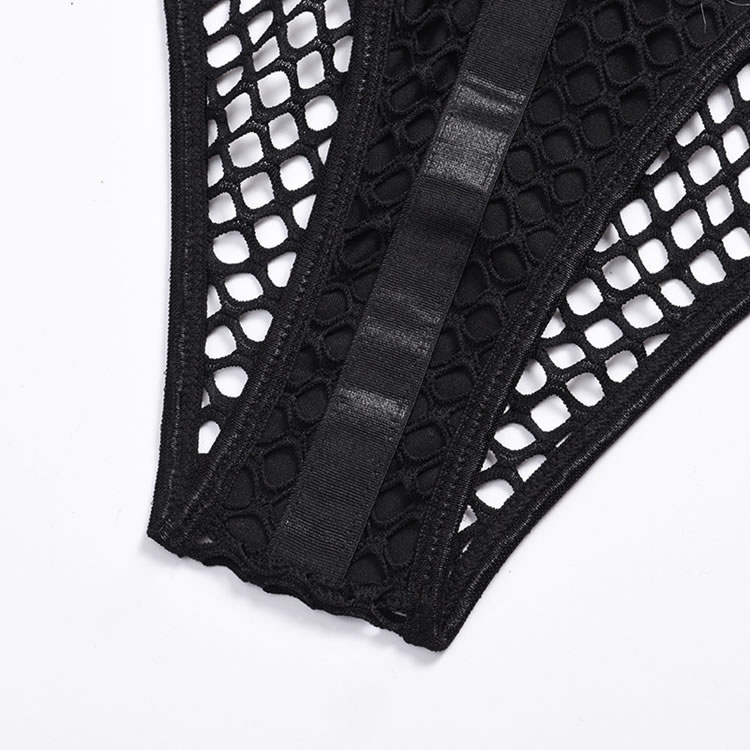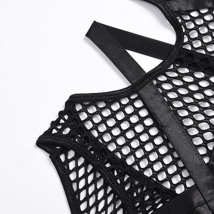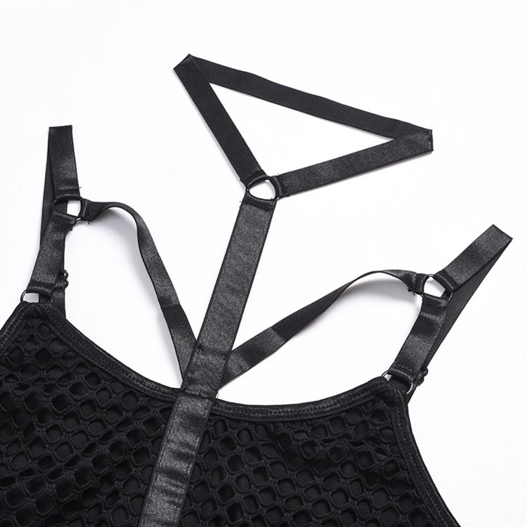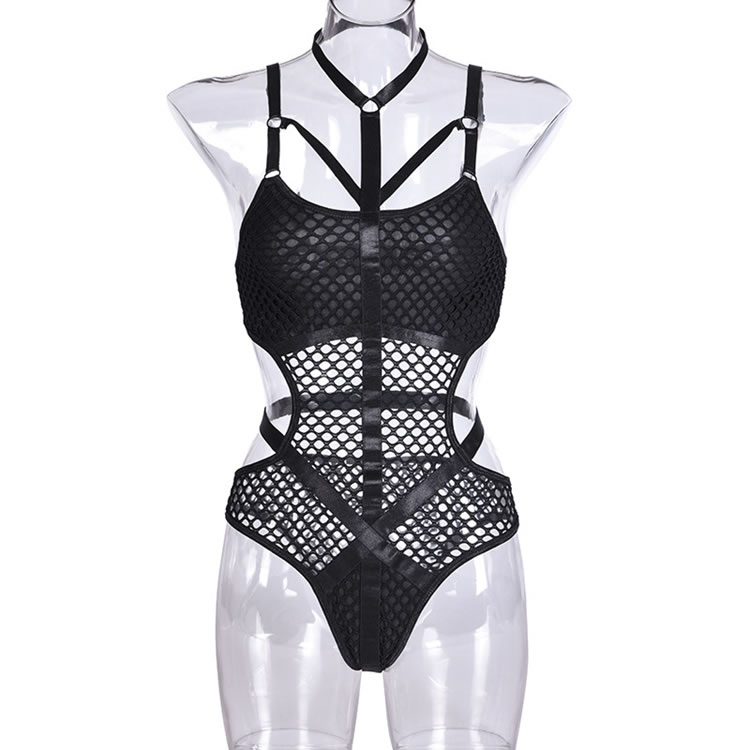 Turn up the heat in this provocative black teddy featuring a high harness neck, O-ring accents, a strappy sheer fishnet bodice, open sides, adjustable spaghetti straps, a hook and eye back closure, and a cheeky cut back.