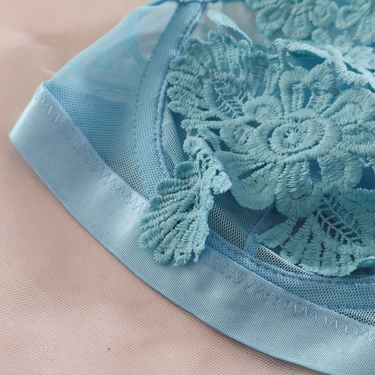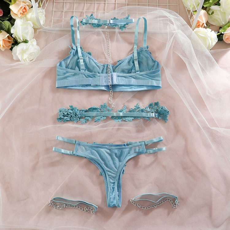 Dream of your night to come in this stunning bra set featuring sheer mesh applique cups, adjustable shoulder straps, a hook and eye back closure, and a matching panty with an applique detail, double hip straps, and a thong cut back, wraparound leg garters, an adjustable choker harness with applique bodice panel.