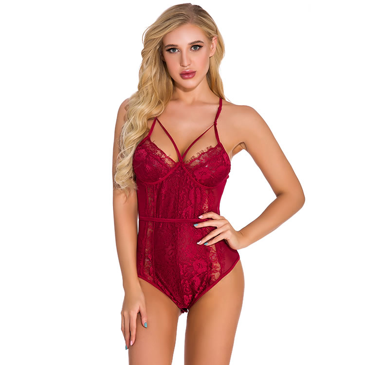 Long for late night love in this stunning lace teddy featuring soft lace cups with strappy bust details, adjustable spaghetti straps, and a cheeky cut back.