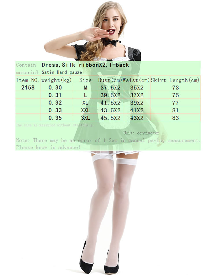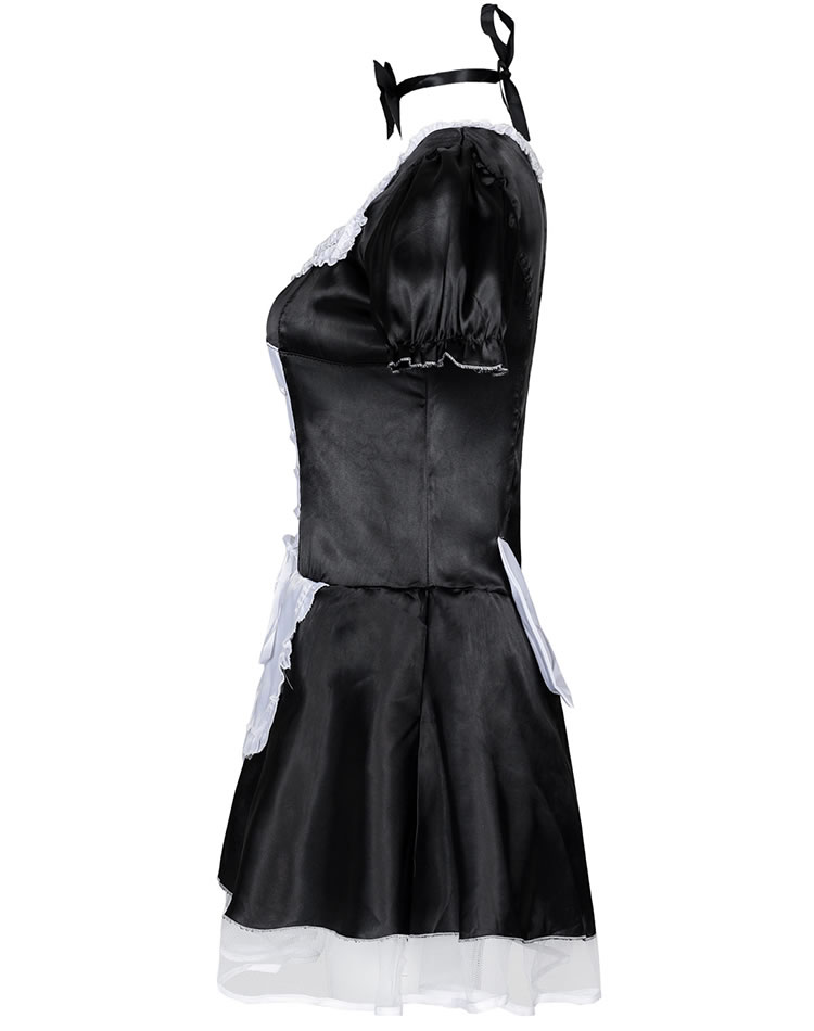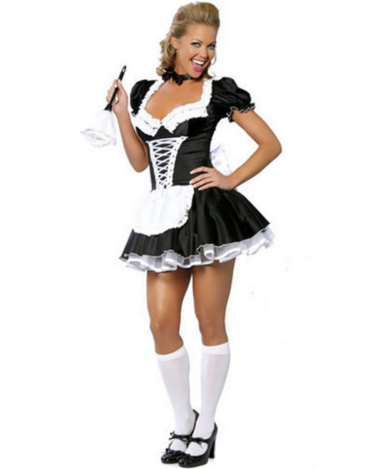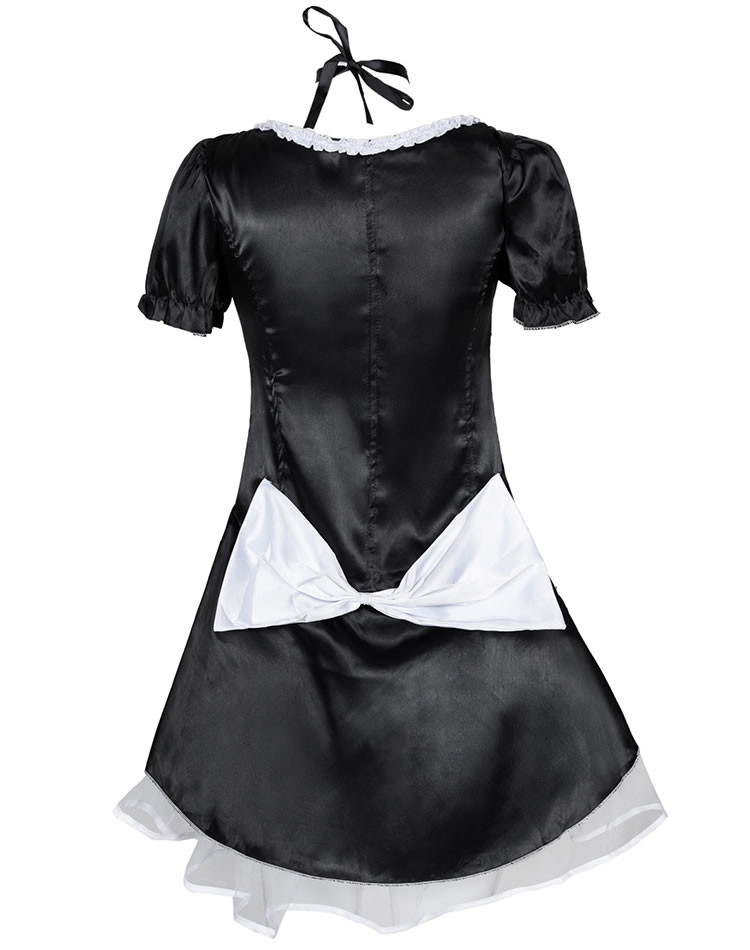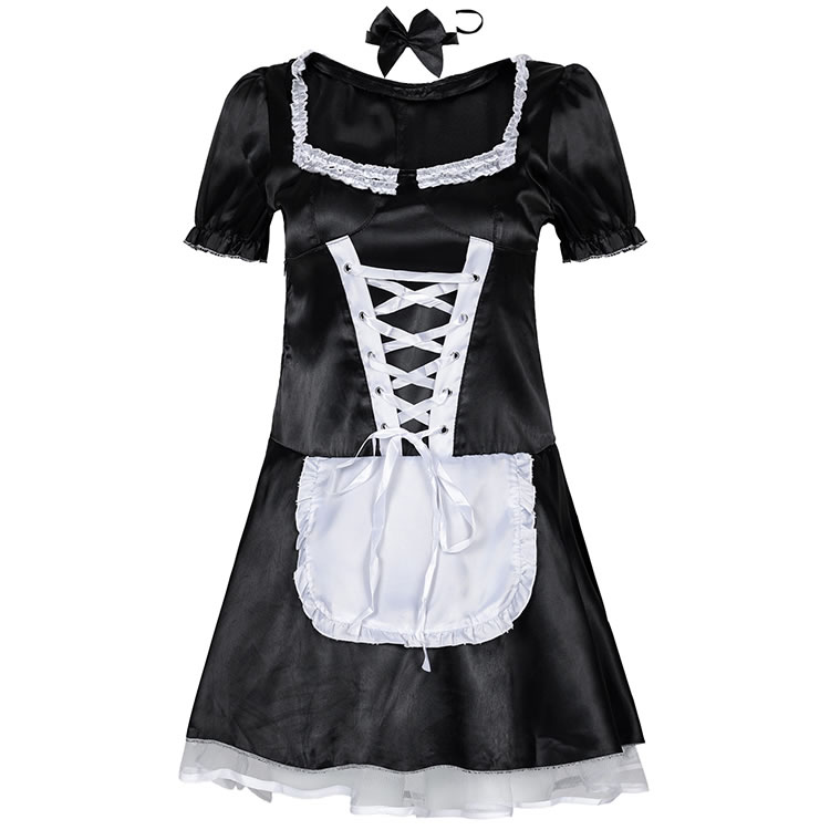 Get yourself in the tiny mindset in this Femme De Menage costume featuring a black dress, puffed sleeves, a white satin apron with a ruffled trim, and a choker. (Feather duster, and thigh high stockings not included.)
