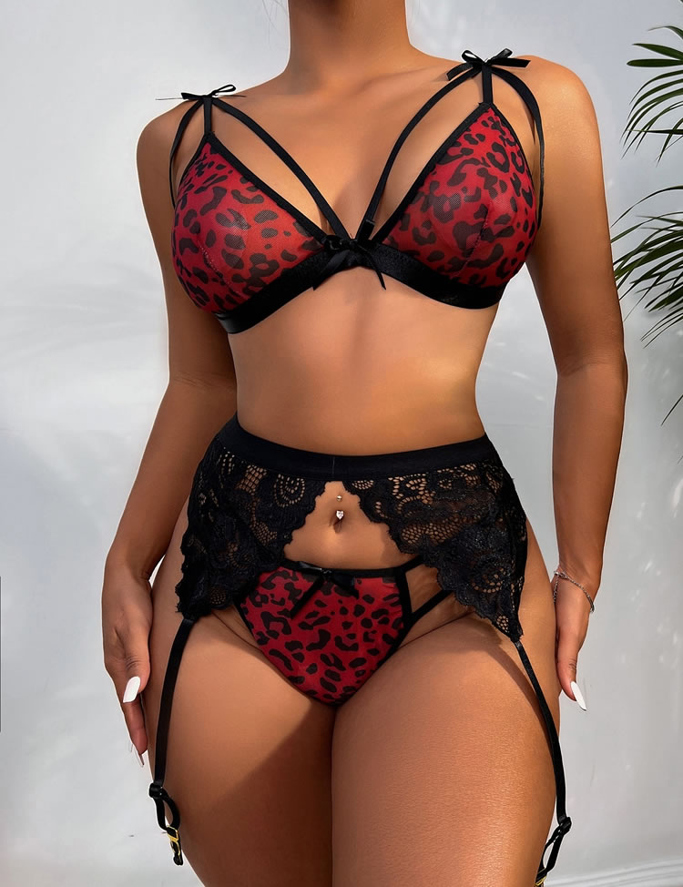 Don't be an average jungle cat. Bring out the babe in you with this exclusive bra set featuring sheer leopard mesh triangle cups with strappy bust detailing, adjustable spaghetti straps with satin bow accents, a hook back closure, a matching garter belt with adjustable garter straps, and a matching thong.
