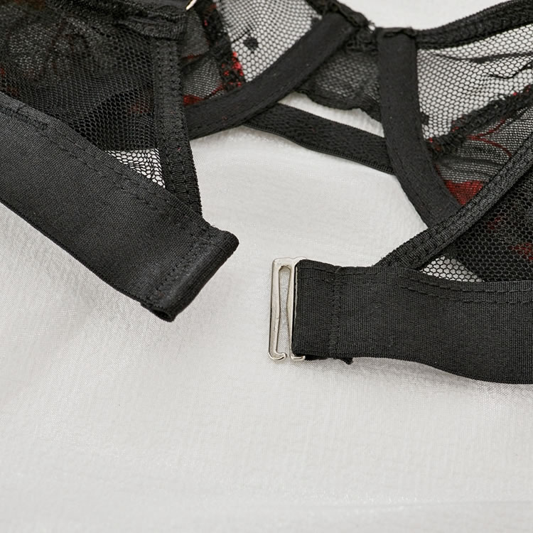 Bring seduction to the table in this tantalizing bra set featuring sheer lace underwire cups, adjustable spaghetti straps, a hook and eye back closure, a high waisted garter belt with adjustable garters, wraparound leg garters, and a matching panty.