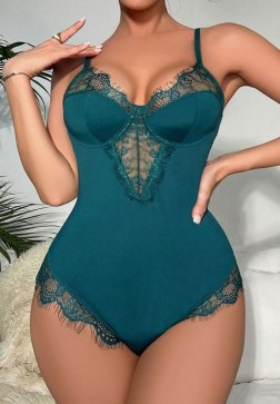 Show off your best assets in this sexy teddy featuring soft cups with an eyelash lace trim, adjustable spaghetti straps, an opaque bodice with a front lace panel, a hook and eye back closure with a back keyhole opening, and a cheeky cut back.