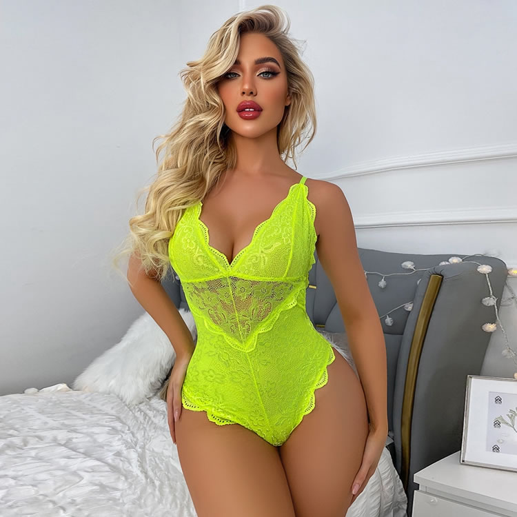 This gorgeous lace teddy features a plunging V-neckline with a scalloped lace trim, beautiful sexy intricate lace cups, criss-cross adjustable spaghetti straps, a sexy lace bodice, and a cheeky cut back with a scalloped hem.