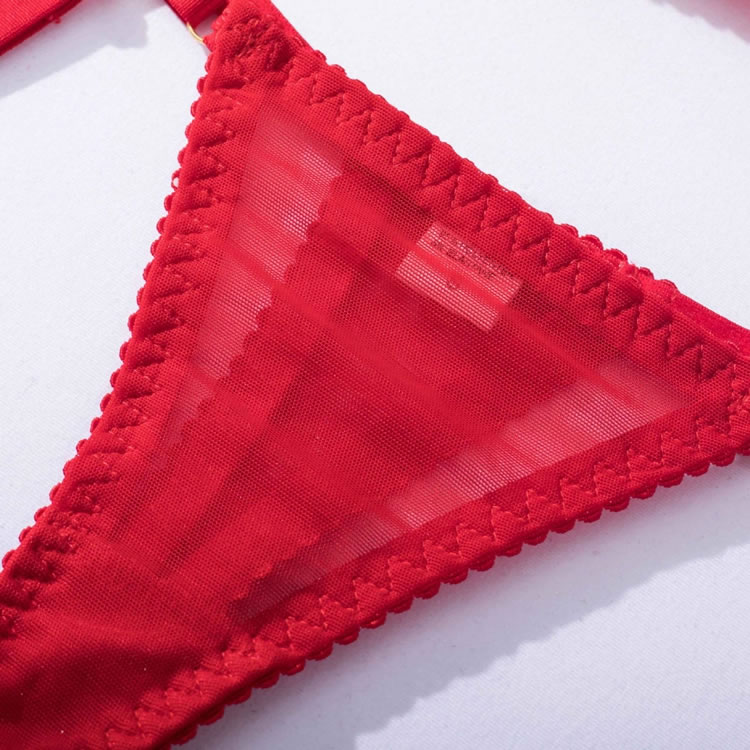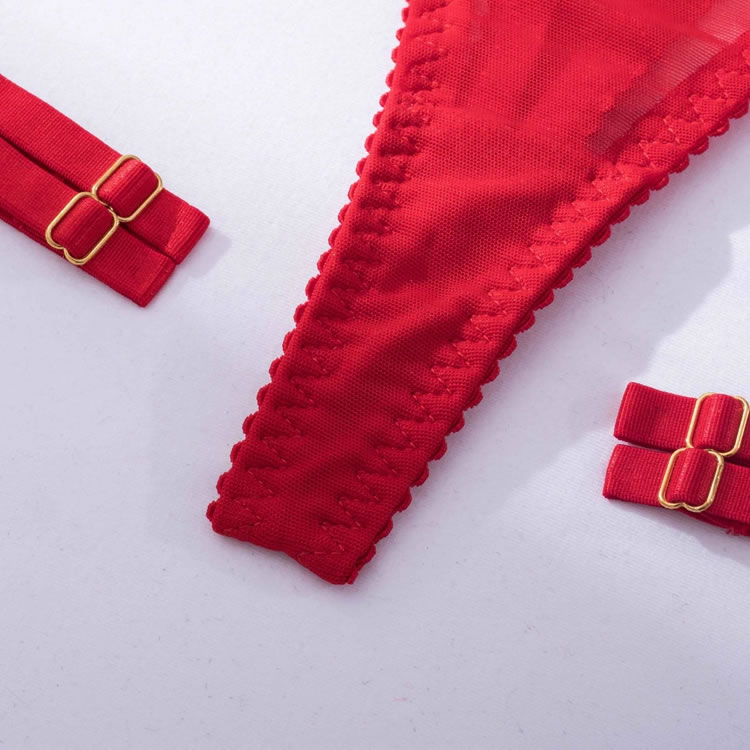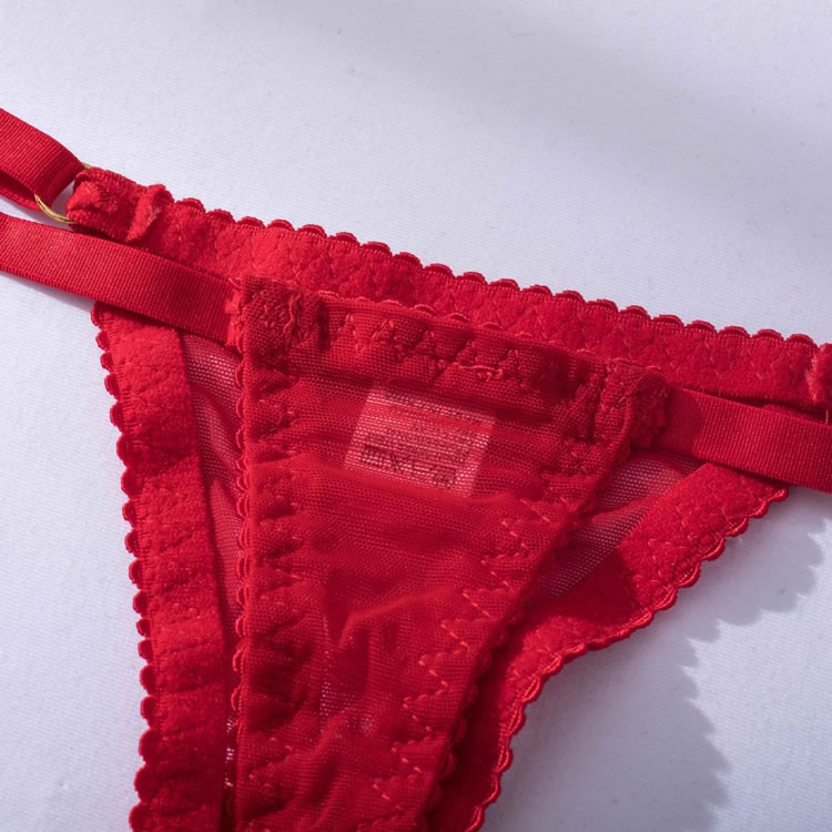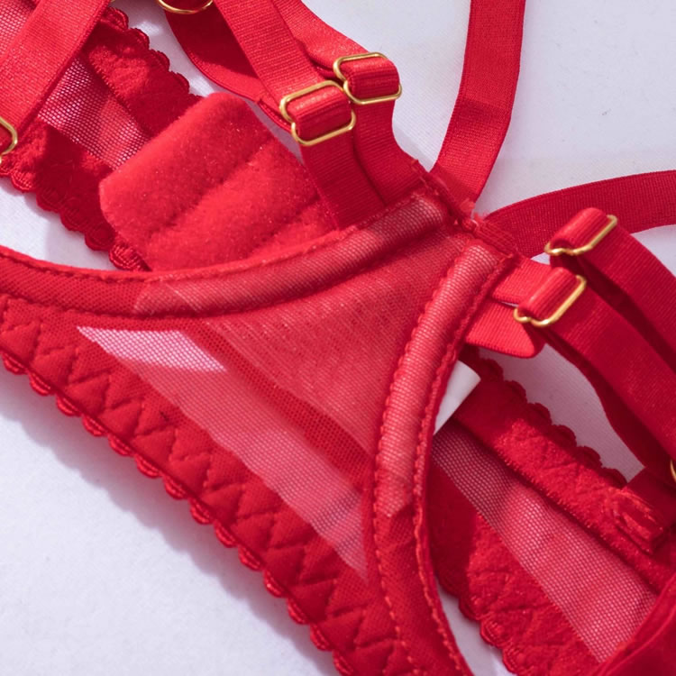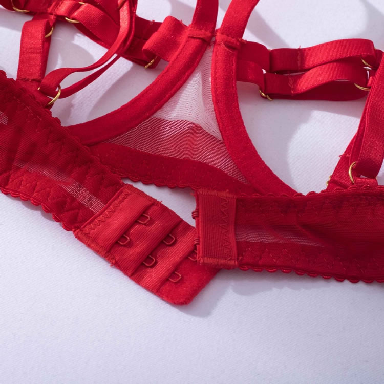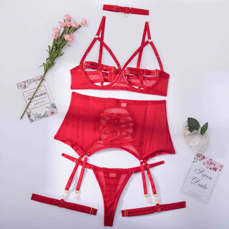 Surprise your sweetie in this sexy bra set featuring strappy open underwire cups, a choker with O-ring accents, adjustable shoulder straps, a hook and eye back closure, a matching garter belt with djustable garter straps, wraparound leg garters, and matching panty with a thong cut back.