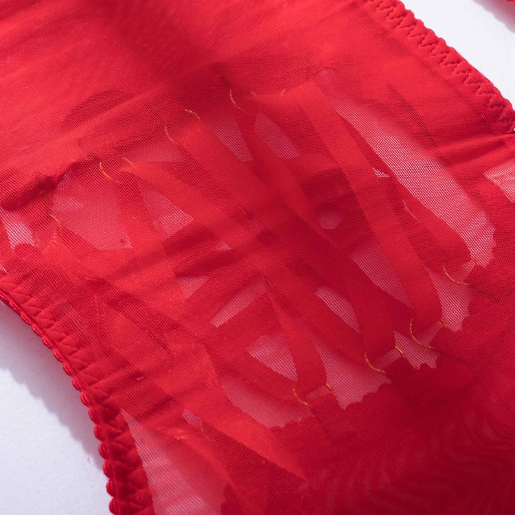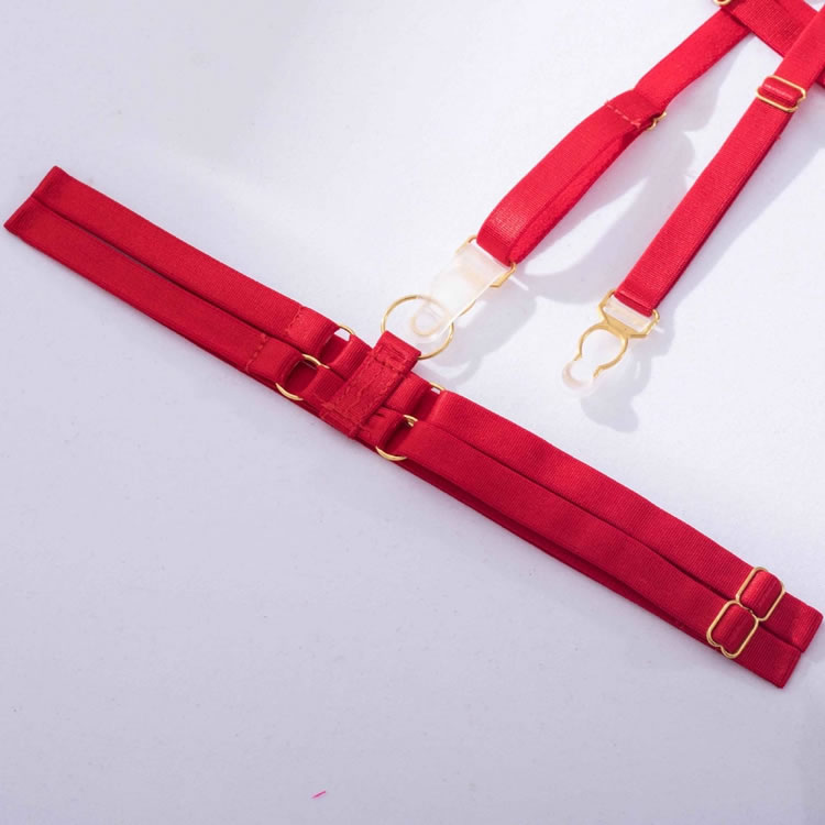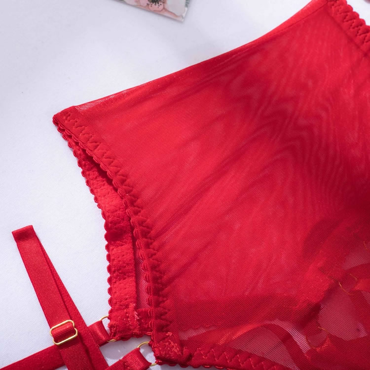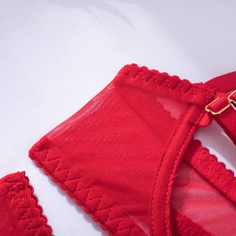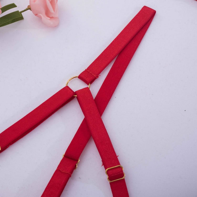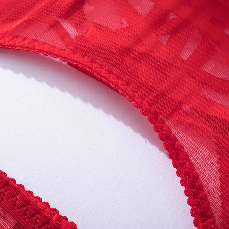Surprise your sweetie in this sexy bra set featuring strappy open underwire cups, a choker with O-ring accents, adjustable shoulder straps, a hook and eye back closure, a matching garter belt with djustable garter straps, wraparound leg garters, and matching panty with a thong cut back.