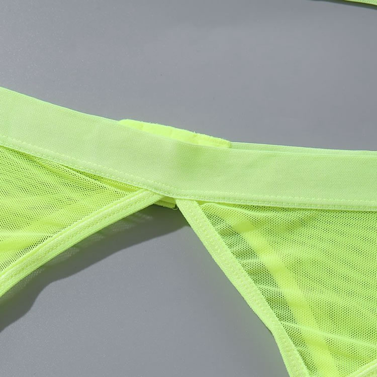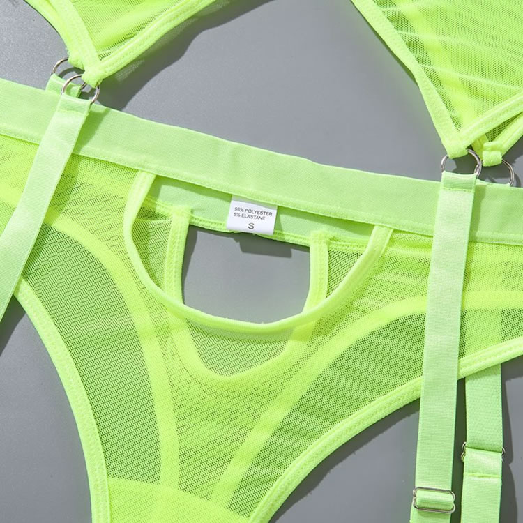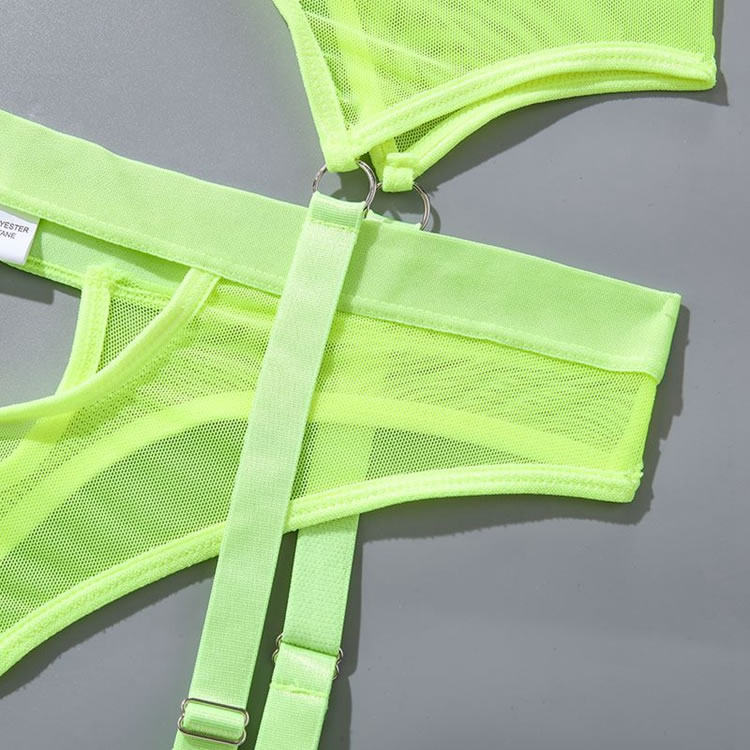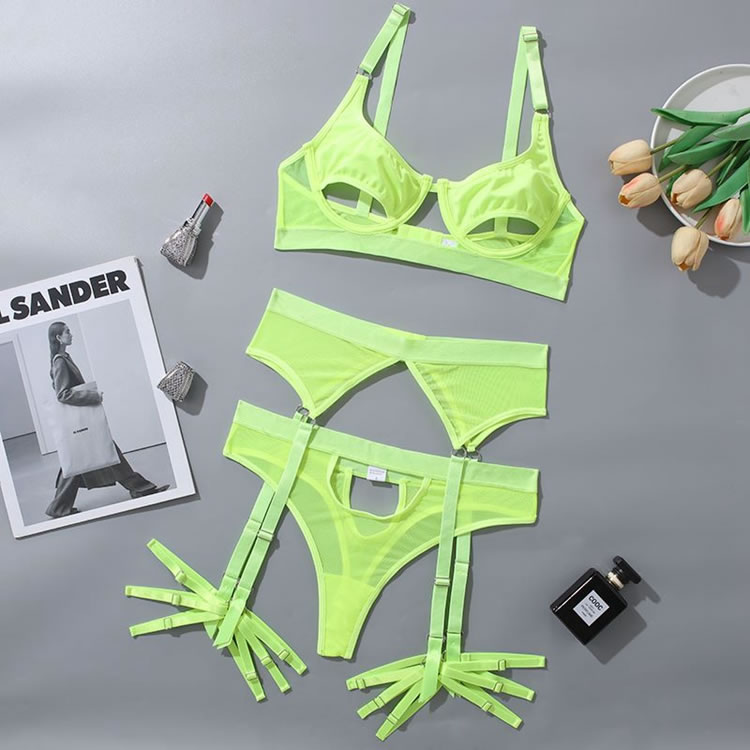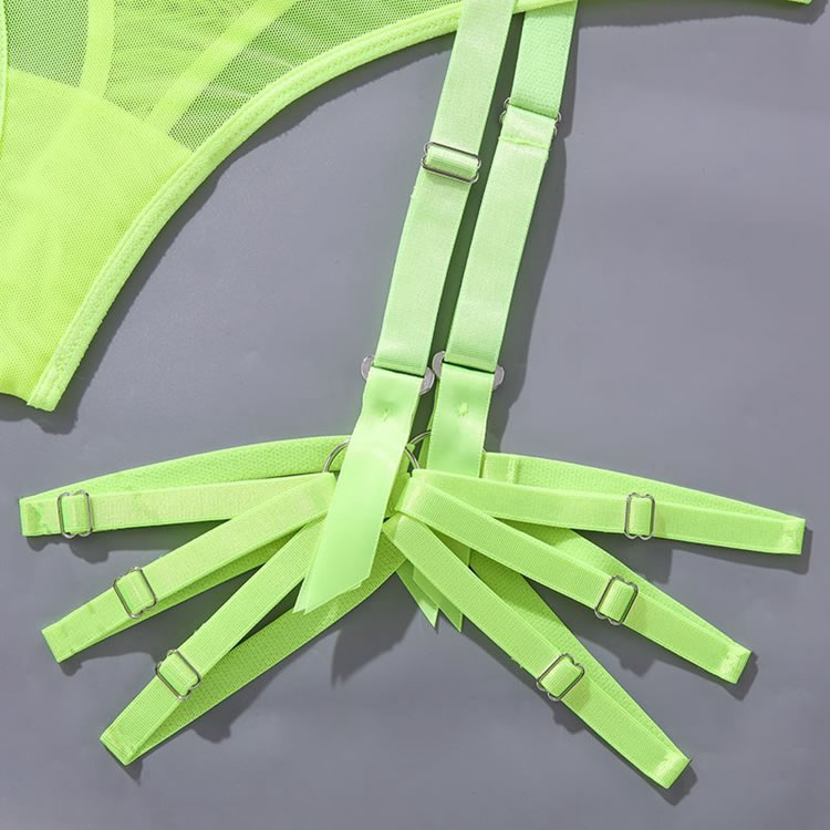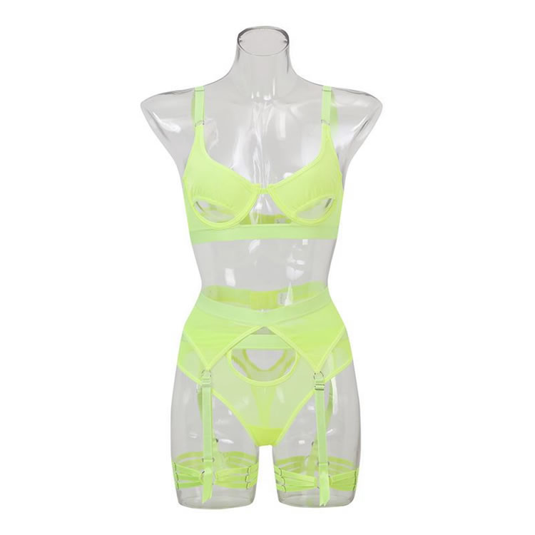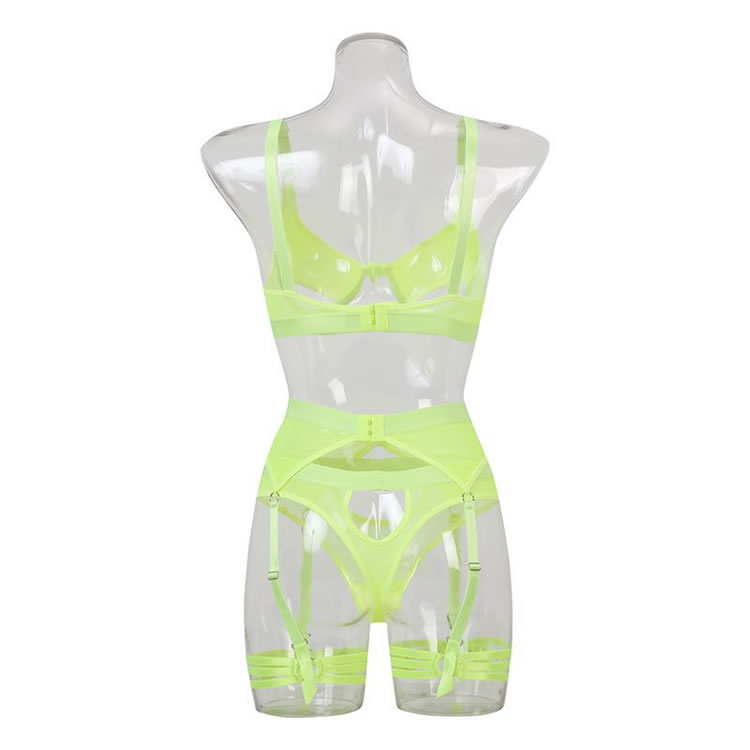 Your lover will lust over you in this enticing bra set featuring soft underwire cups with peek-a-boo under boob cut-outs, adjustable spaghetti straps, a hook and eye back closure, a matching high waisted garter belt with adjustable garter straps, adjustable wraparound leg garters, and a matching panty.