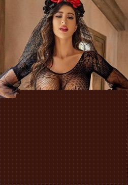 Til death do you part...or not. Mourn your lost vows in this Heartbreak Bride costume featuring a black dress, a sheer lace bodice, a sheer mesh skirt, and sheer lace sleeves. (Headpiece not included.)