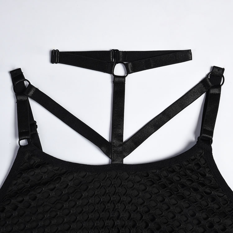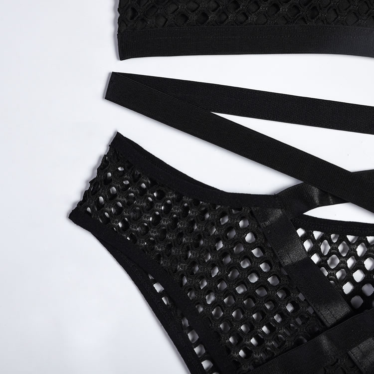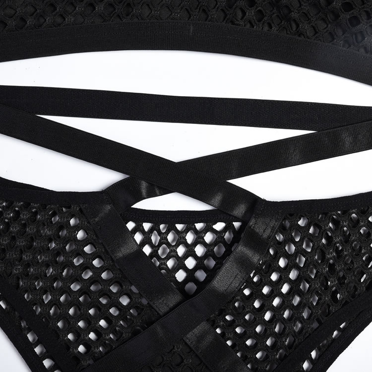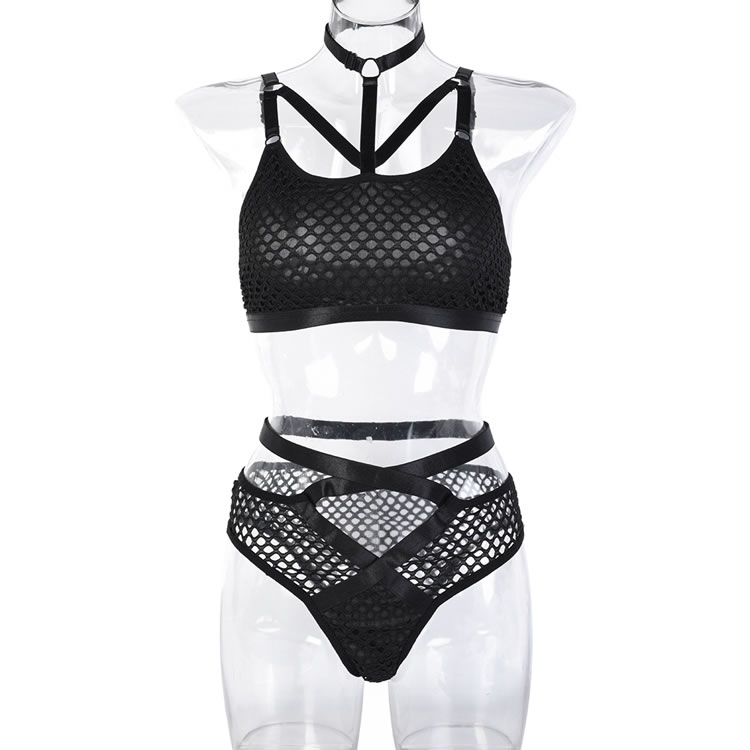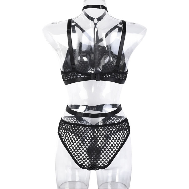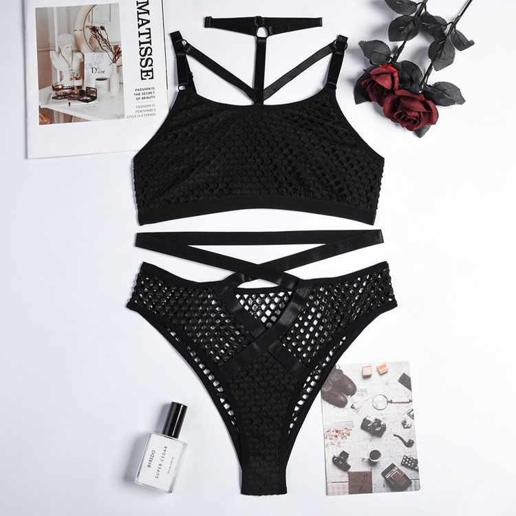 Let him fantasize about you for long after your steamy encounter in this exclusive bra set featuring soft cups with strappy detailing, an attached strappy choker harness, adjustable spaghetti straps, a hook and eye back closure, and a matching high waisted panty with a cheeky cut back.