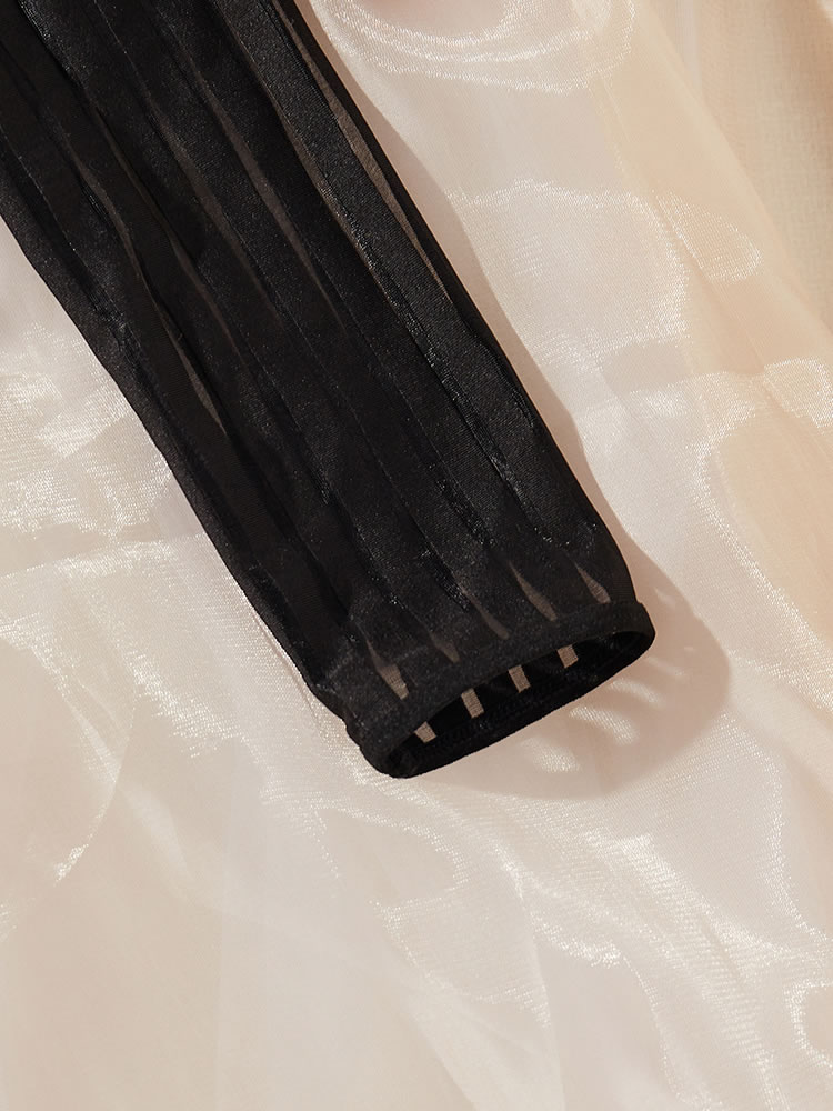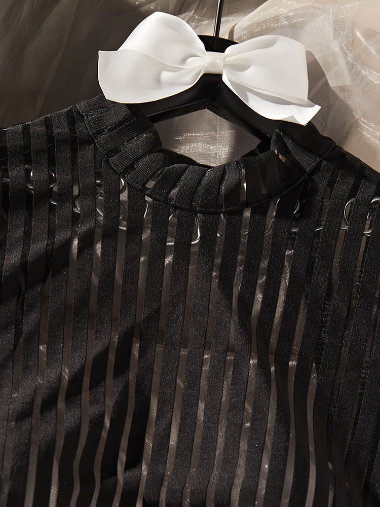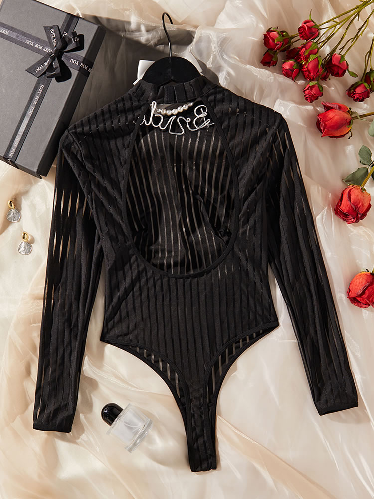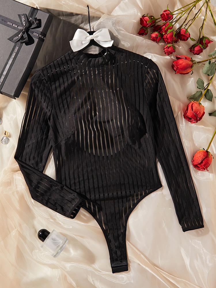 Tempt and tease in this sultry teddy featuring a high neckline, long sleeves, a sheer bodice, a high cut leg, an open back panel, and a thong cut back.