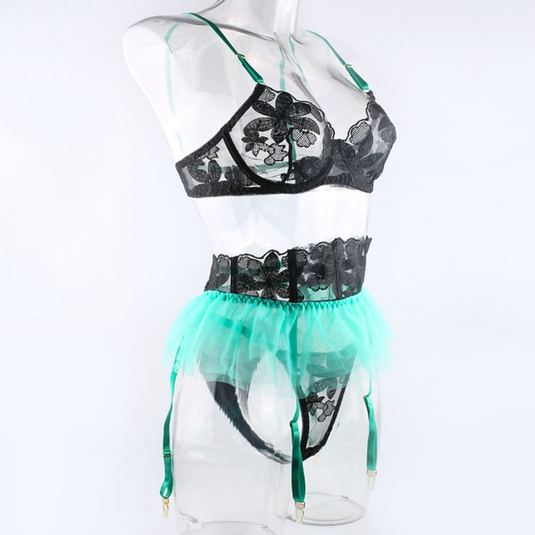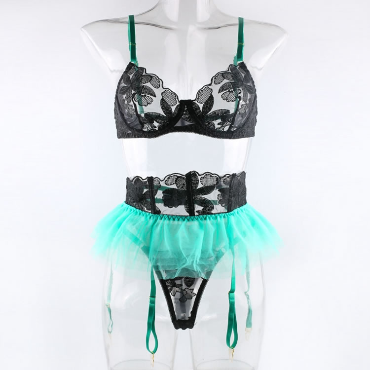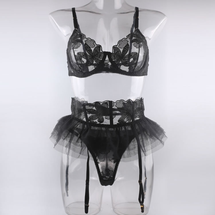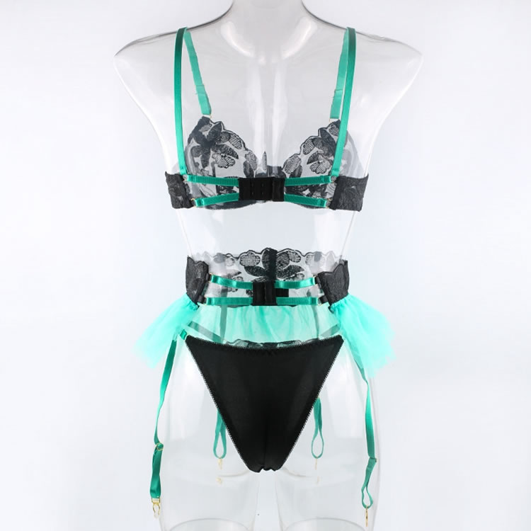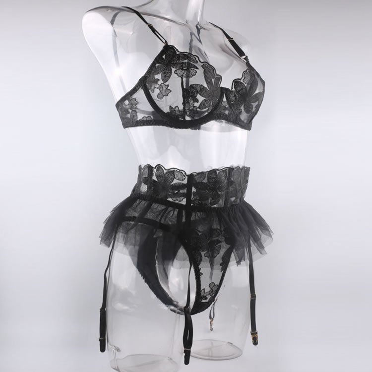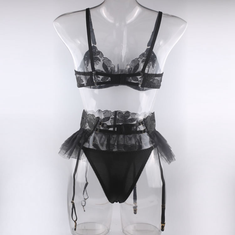 Surprise your honey with this sexy bra set featuring sheer lace underwire cups, adjustable spaghetti straps, a hook and eye back closure, a matching garter belt with adjustable garter straps, and matching panty with a cheeky cut back.