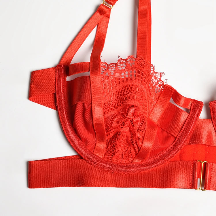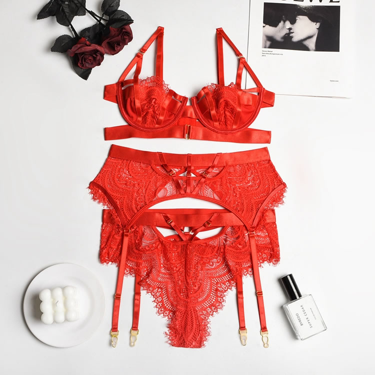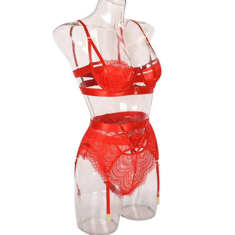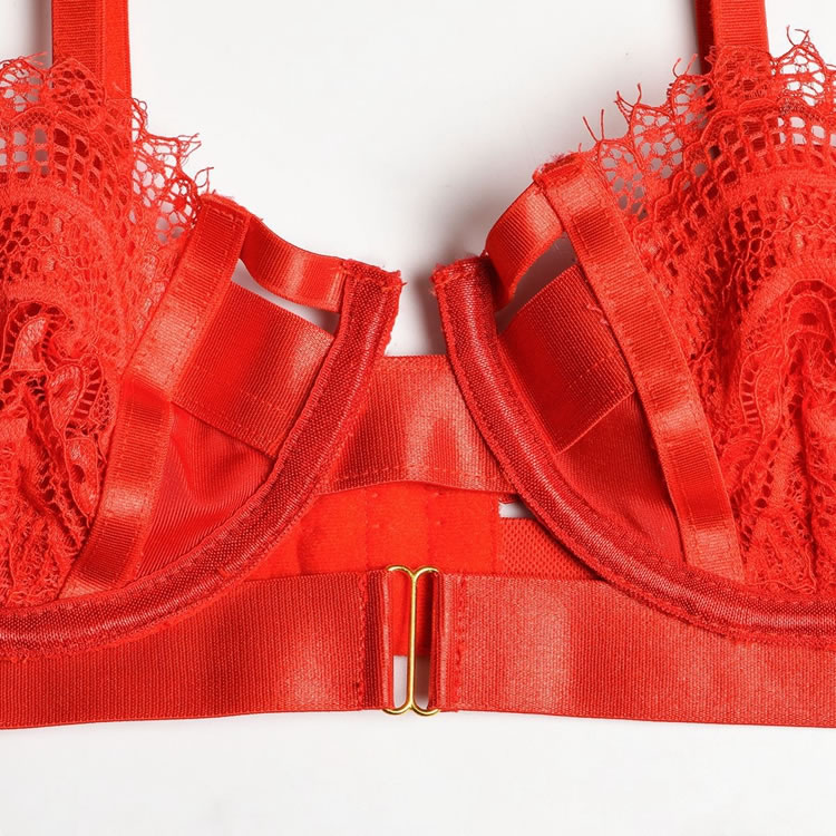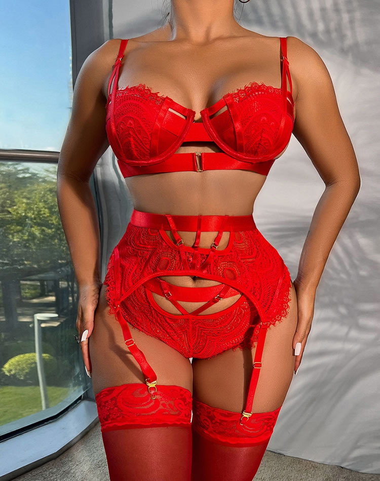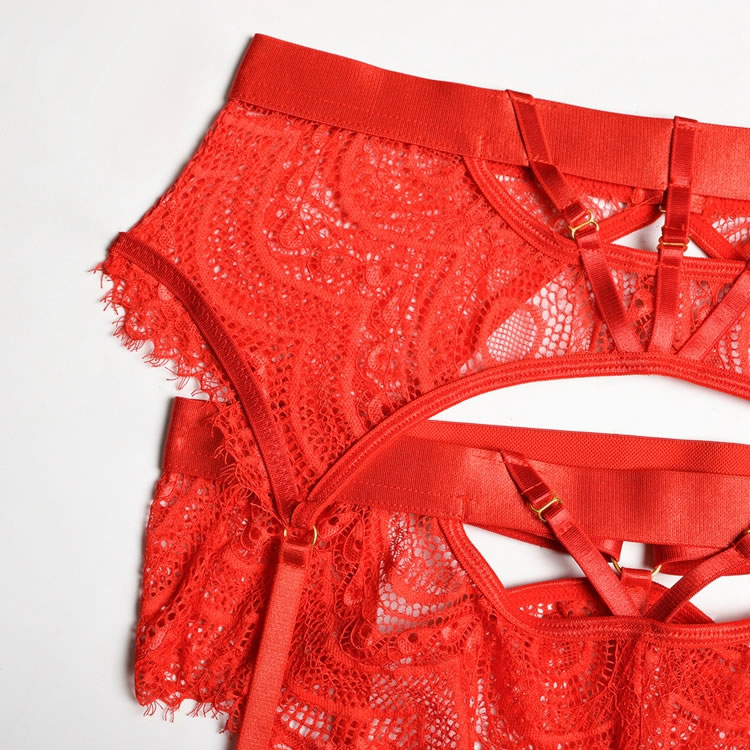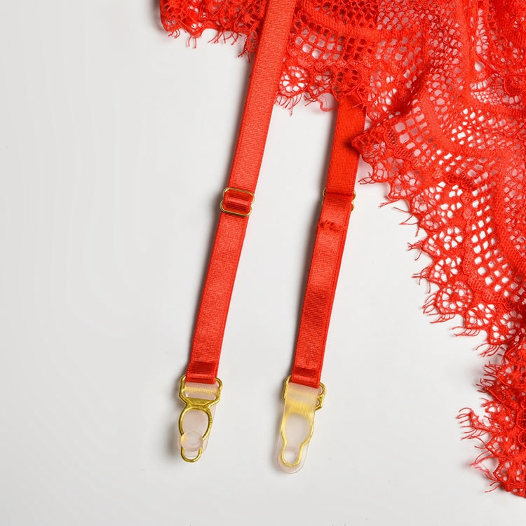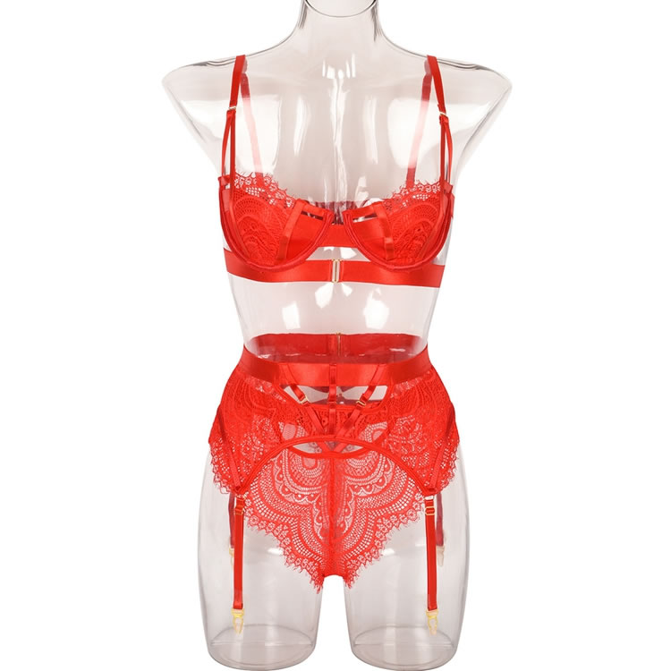 Desire all their affection in this flirty lace bra set featuring eyelash lace underwire cups, adjustable spaghetti straps, a front keyhole opening, a hook and eye back closure, a matching garter belt with adjustable garter straps, a hook back closure, and a matching panty with a thong cut back.