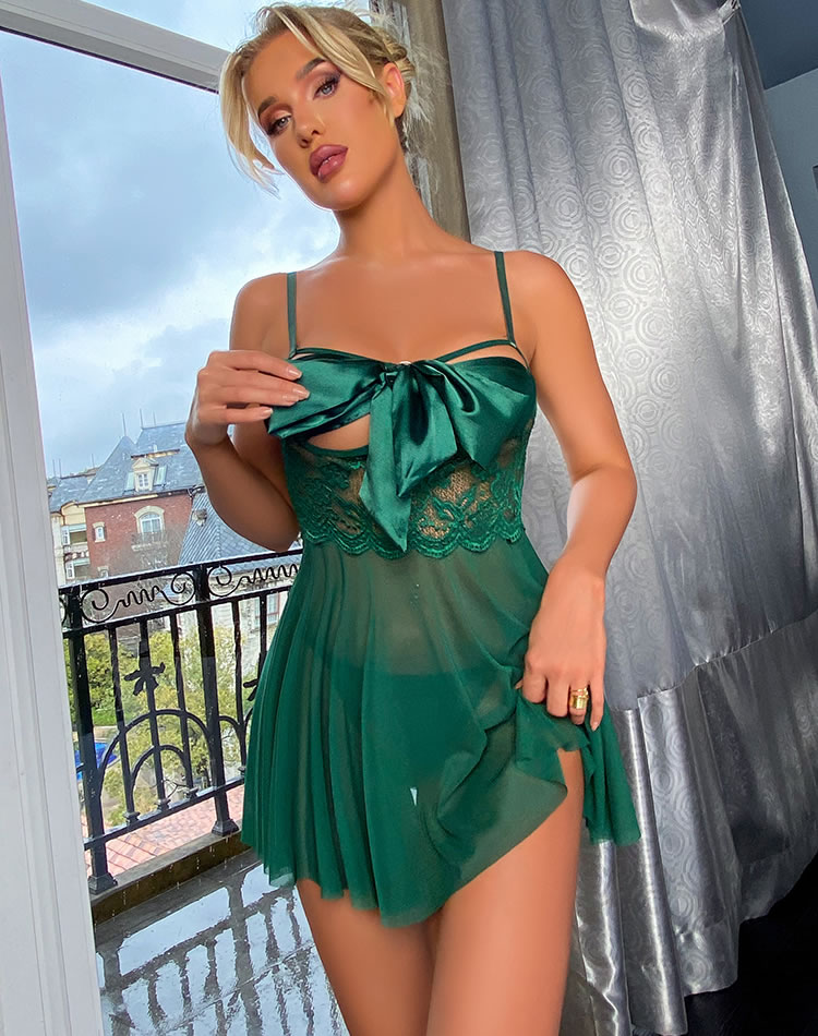 Persuade your babe to stay in for the night in this alluring babydoll set featuring adjustable large satin bow cups, strappy details, adjustable spaghetti straps, a loose flirty skirt, and a matching g-string panty.