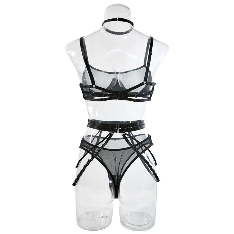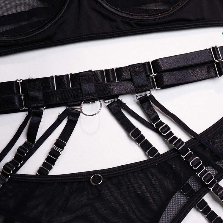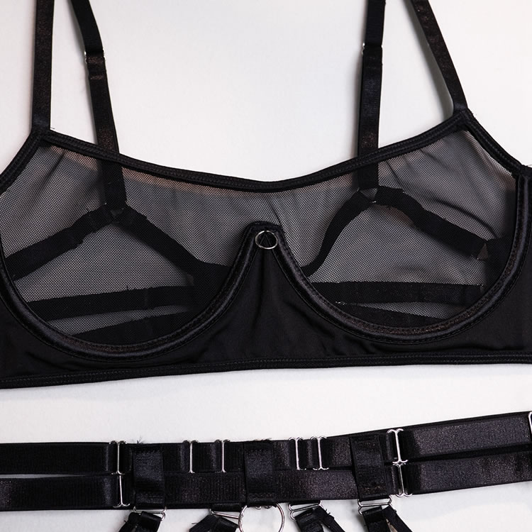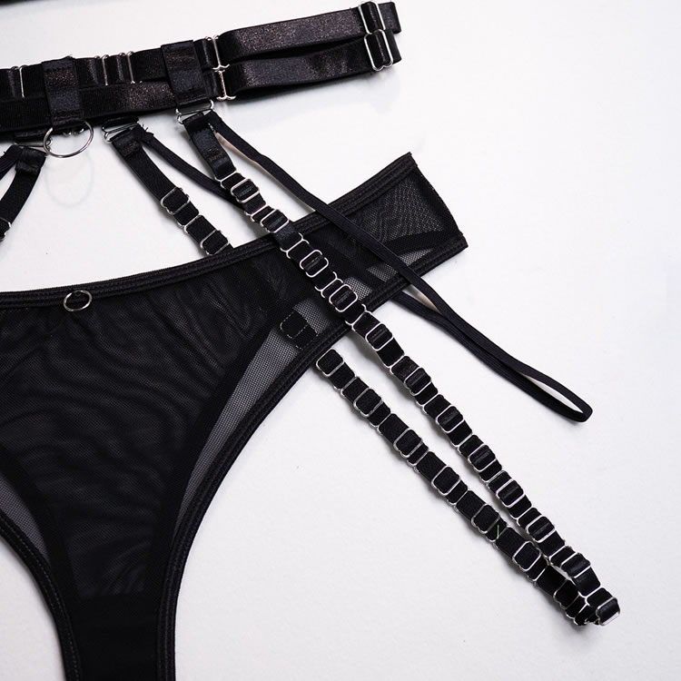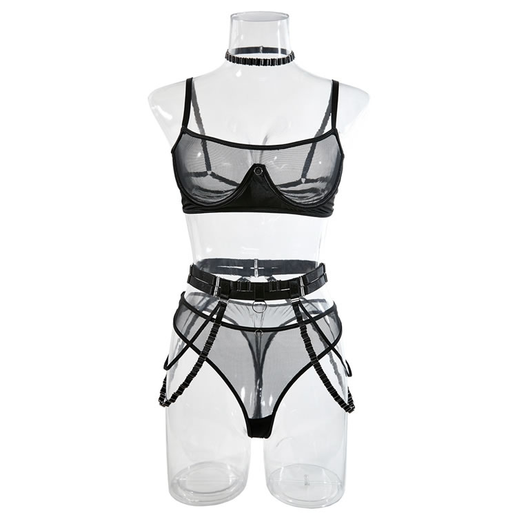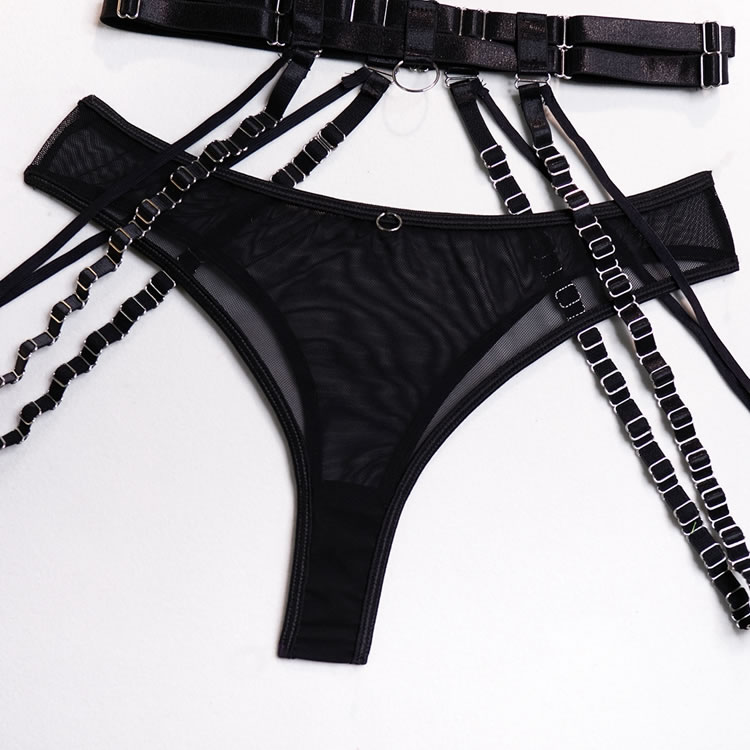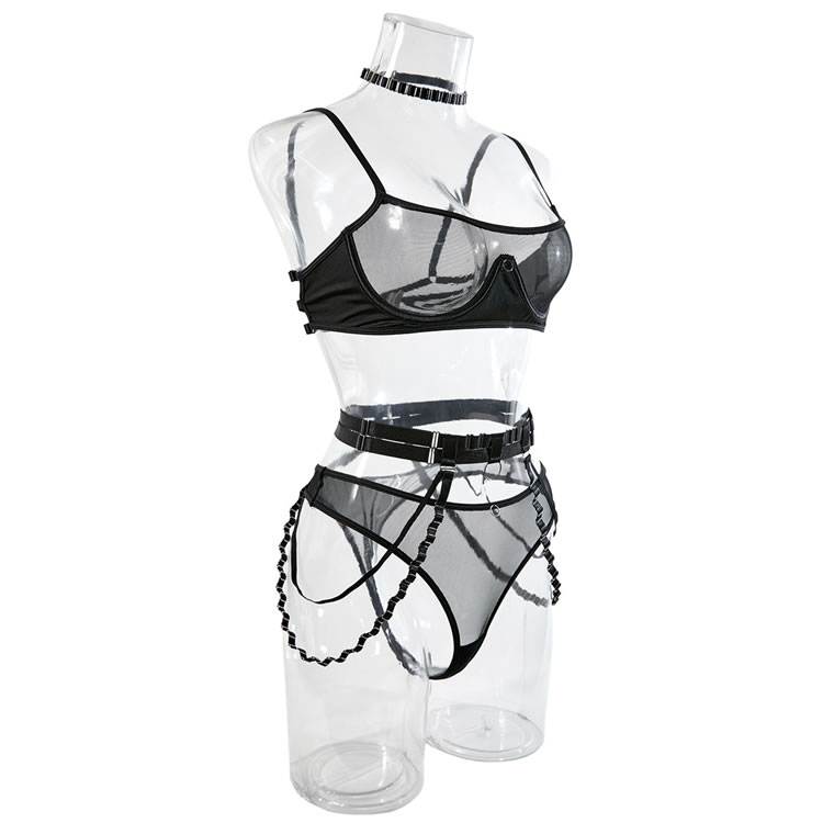 Sheer up your honey in this exclusive bra set featuring sheer mesh underwire cups, adjustable spaghetti straps, a caged back band with a hook and eye closure, a matching high waisted garter belt with hook back closures, draping chain details, and a matching panty.
