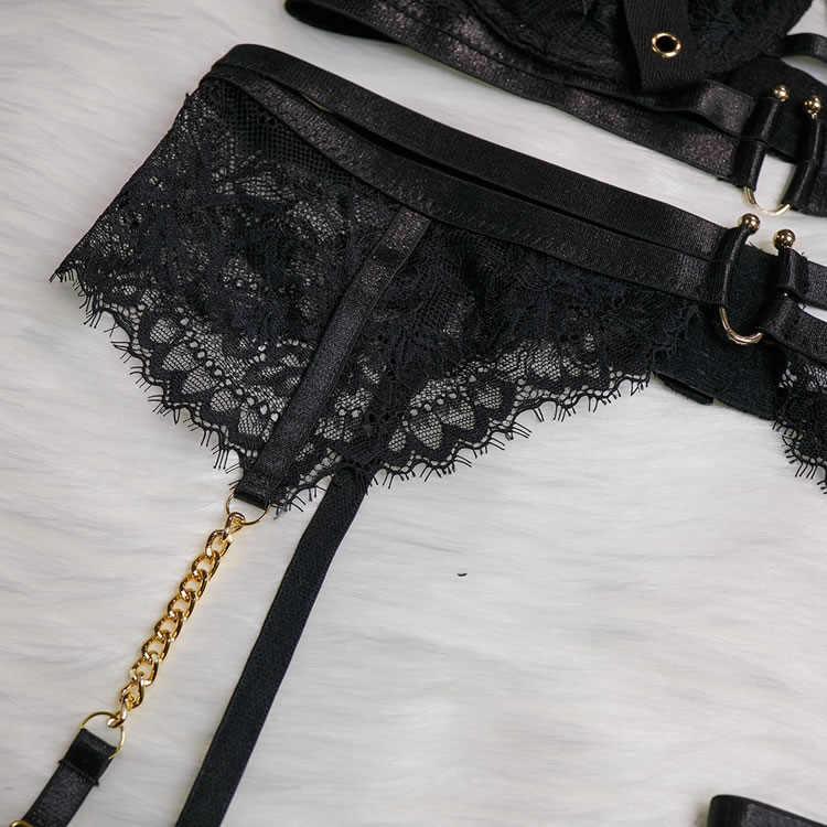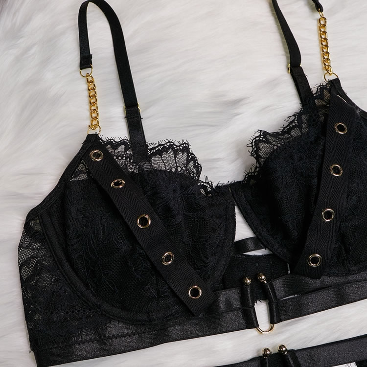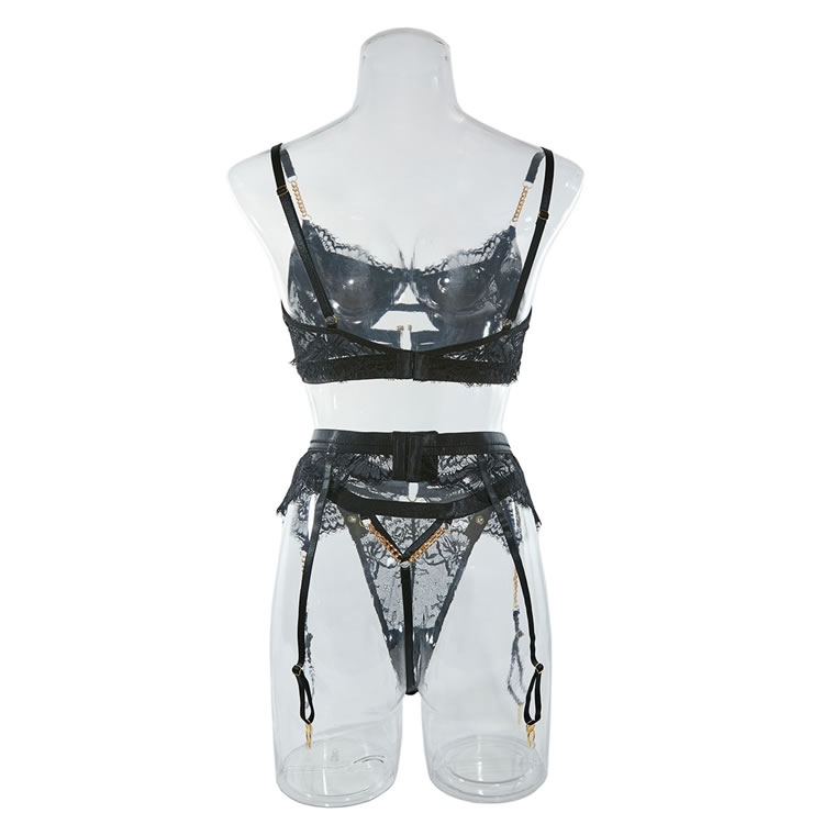 3-piece lingerie set features soft lace underwire cups, adjustable spaghetti straps, a hook and eye back closure, a matching high waisted garter belt with adjustable garter straps, and a matching panty.