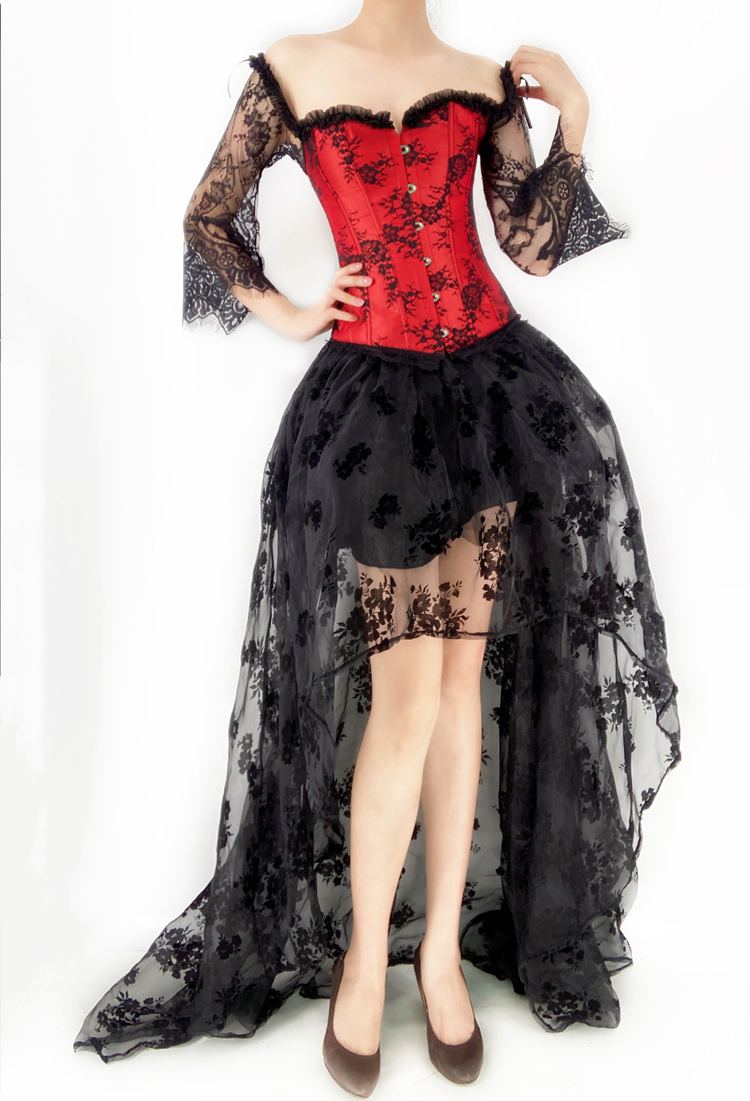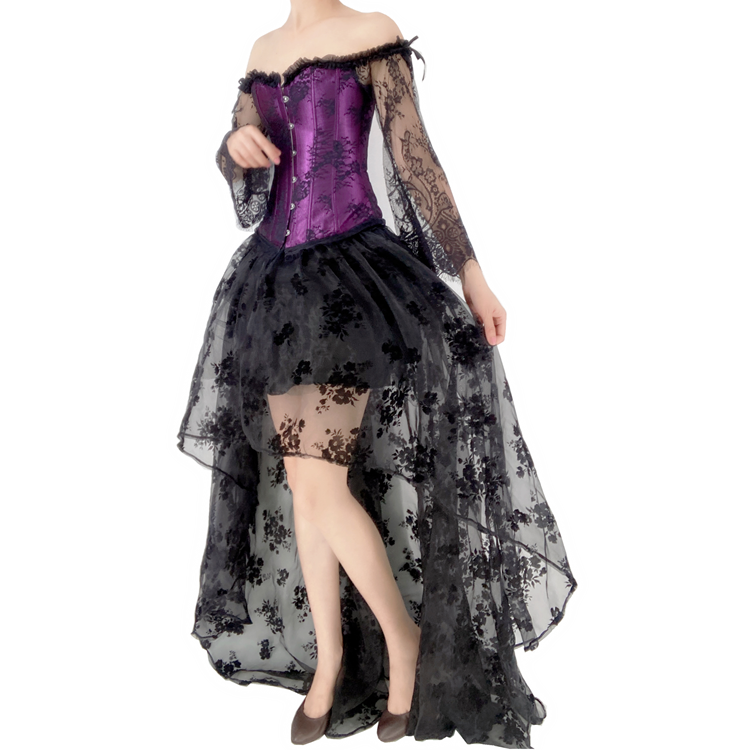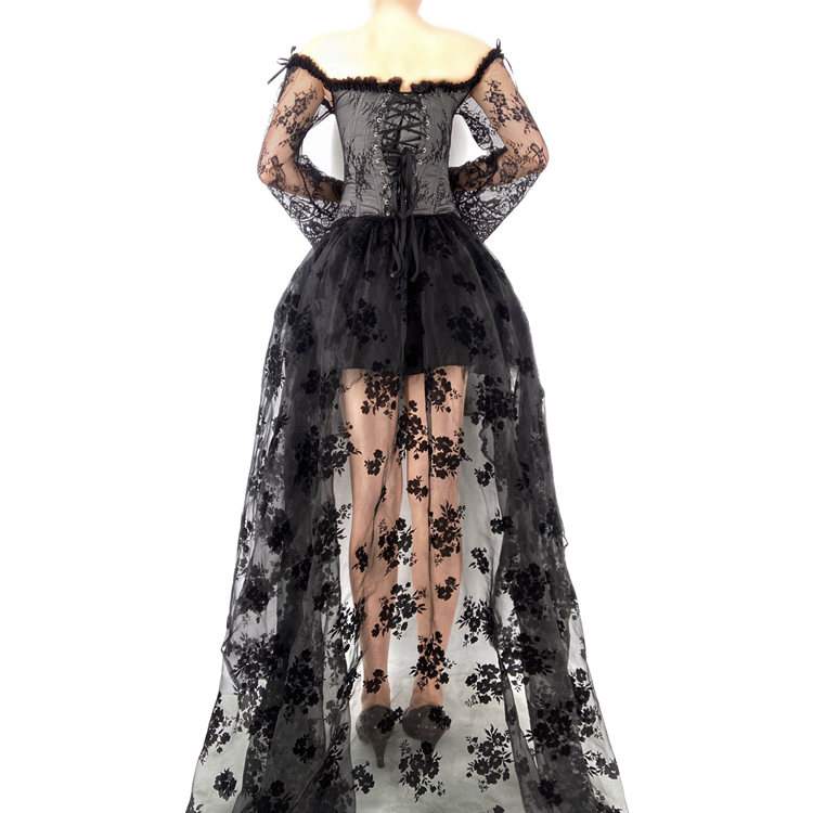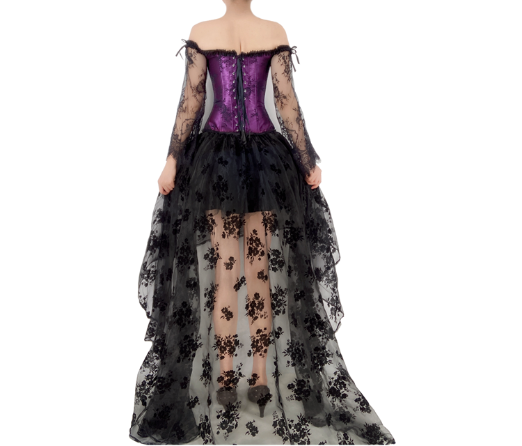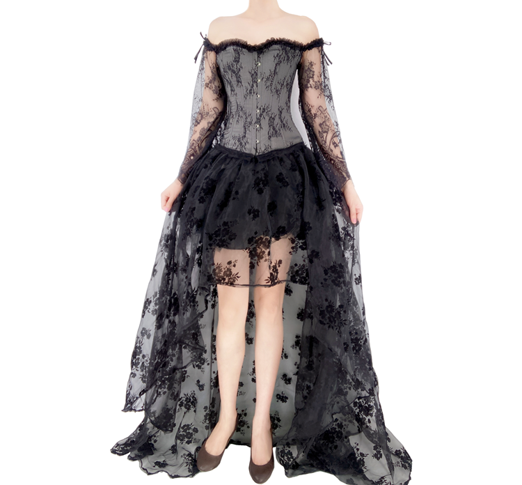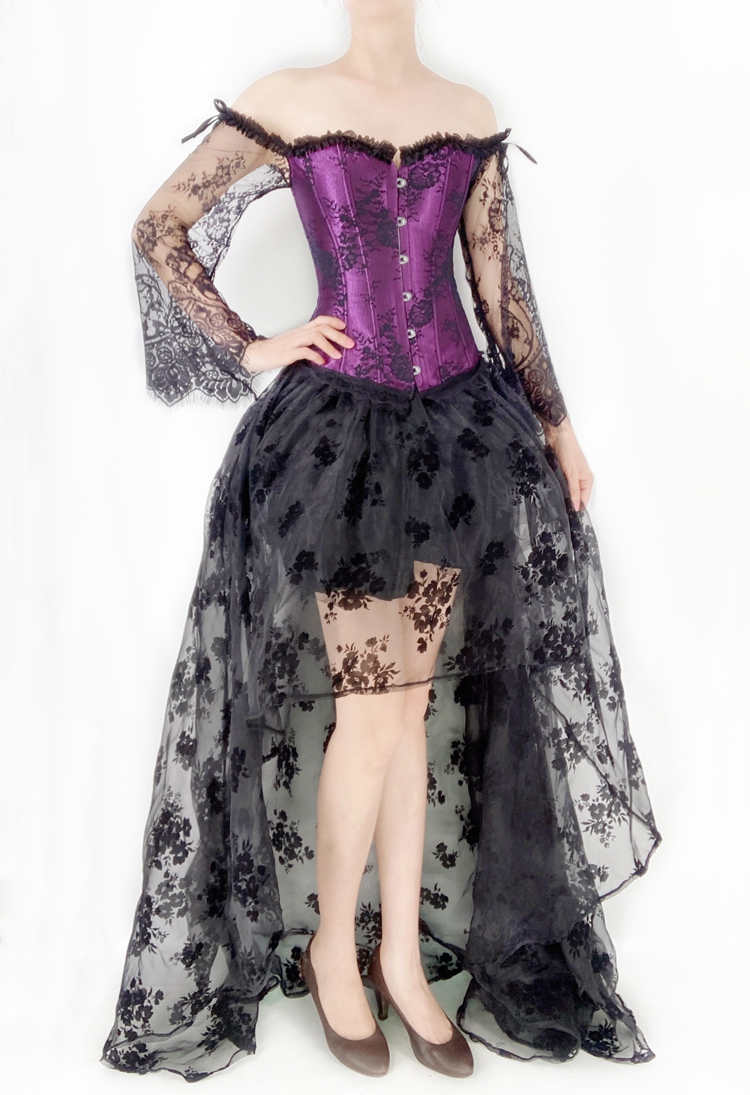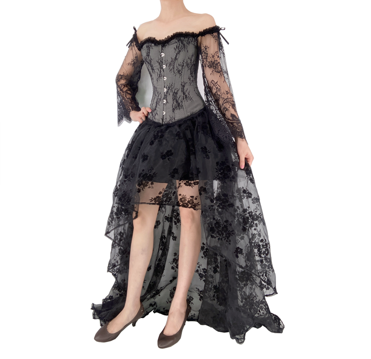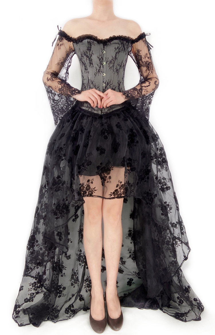 Off shoulder corset featuring long sleeves, front busk closure, lace-up back, and a matching high low skirt.