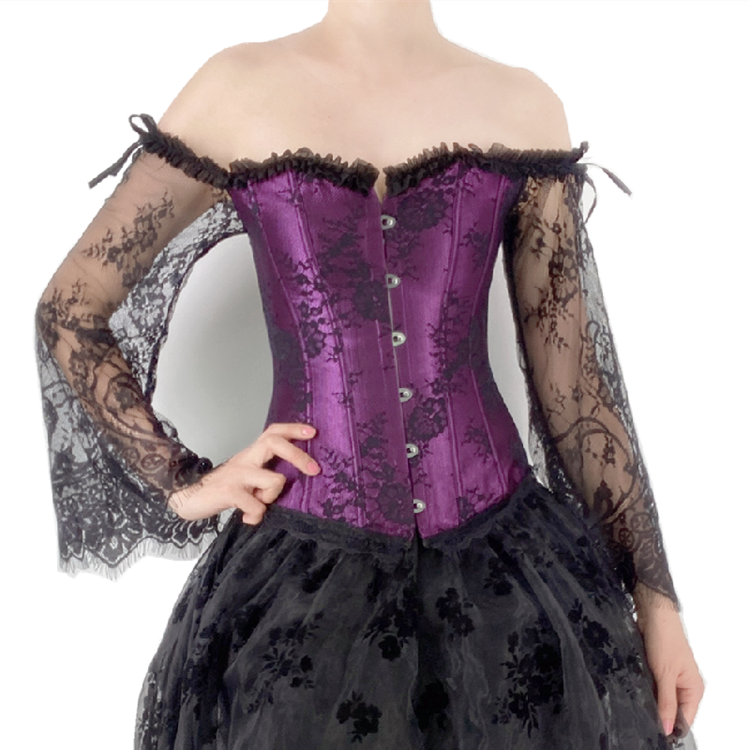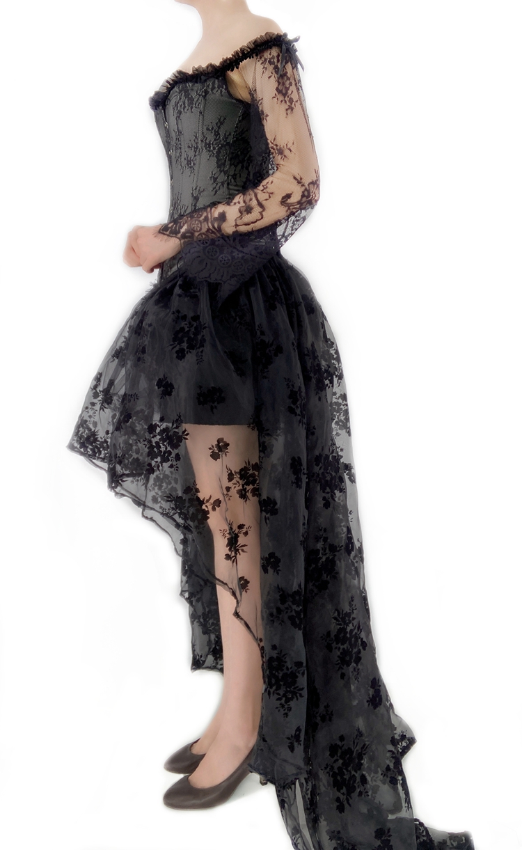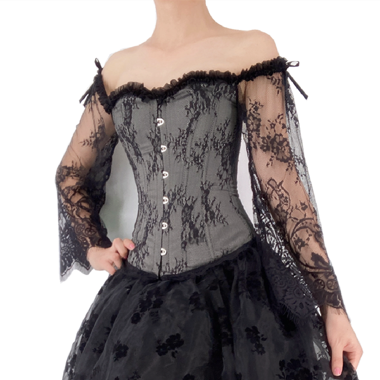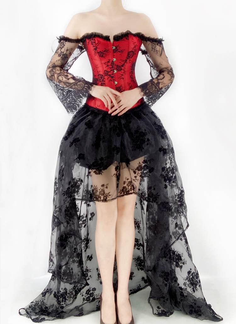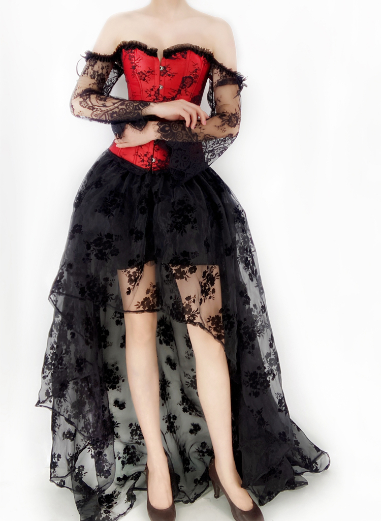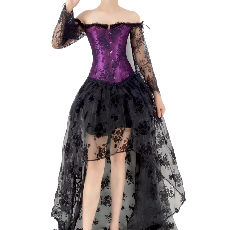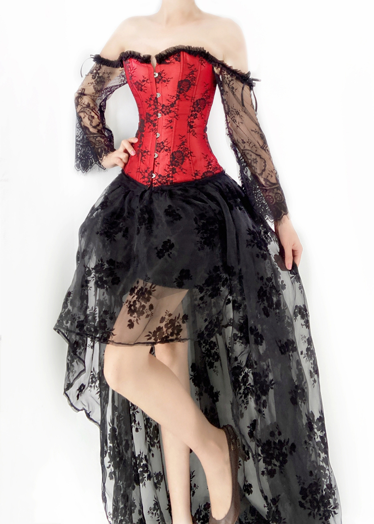 Off shoulder corset featuring long sleeves, front busk closure, lace-up back, and a matching high low skirt.
