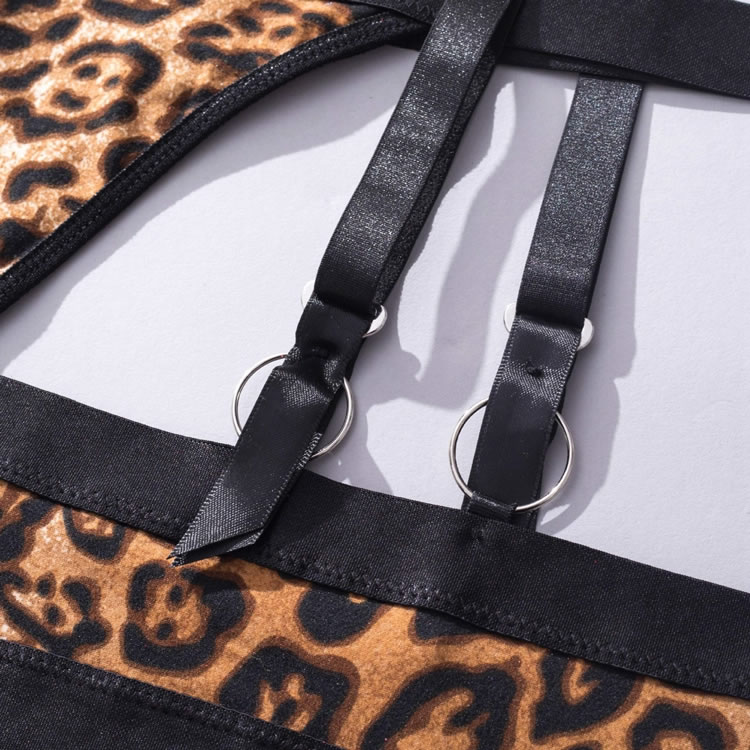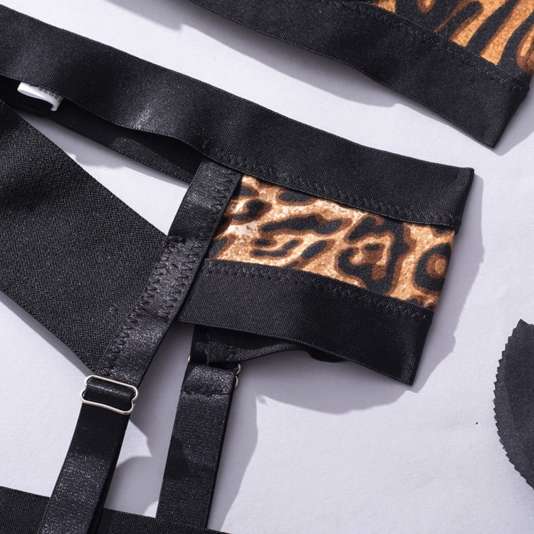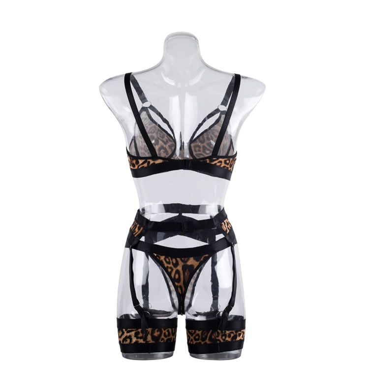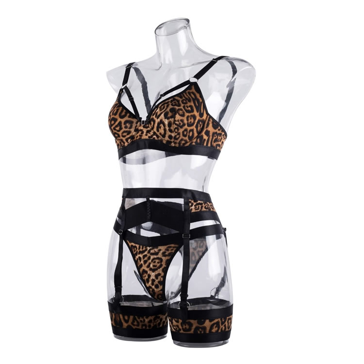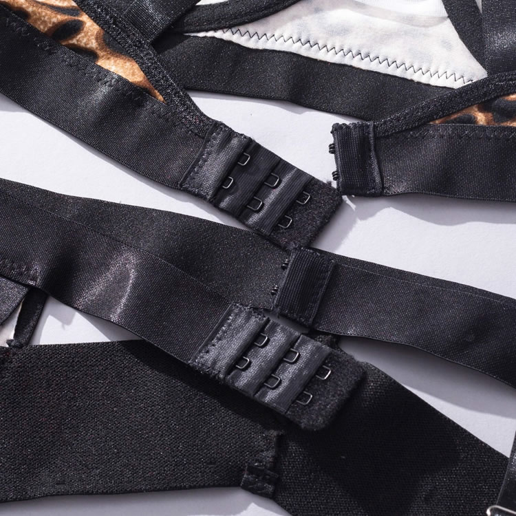 Get in touch with your animalistic side in this fierce bra set featuring soft underwire cups with strappy details, adjustable spaghetti straps, a hook and eye back closure, a high waisted strappy garter belt with adjustable garters, wraparound leg garters, and a matching panty.