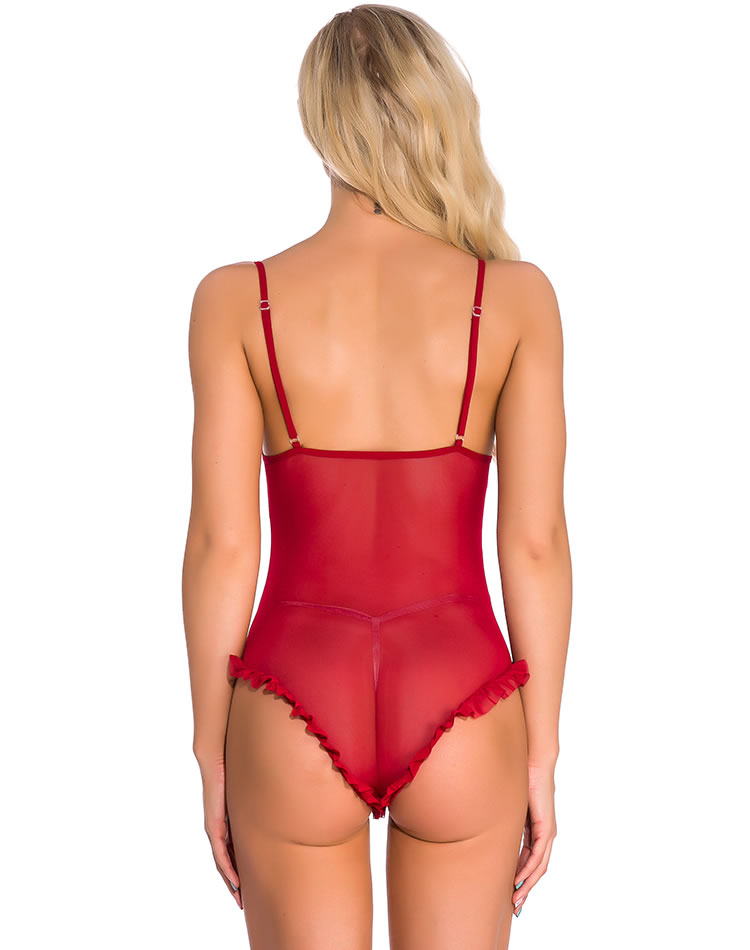 Set the mood for seduction in this gorgeous mesh teddy featuring a V-neckline, sheer lace cups with a scalloped trim, a sheer intricate lace and dot mesh bodice, adjustable spaghetti straps, a ruffled hem, and a thong cut back.