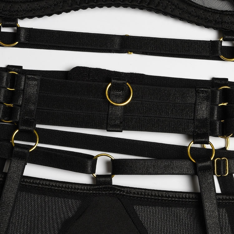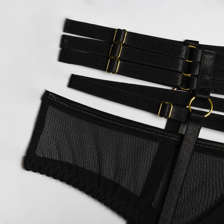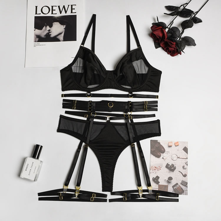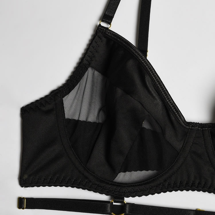 Entice your lover in this sexy bra set featuring sheer underwire cups with strappy bust detailing, adjustable shoulder straps, a hook and eye back closure, a matching garter belt, adjustable garter straps, wraparound leg garters, and a mesh panty.