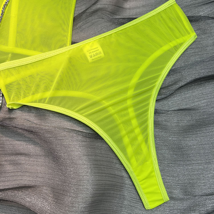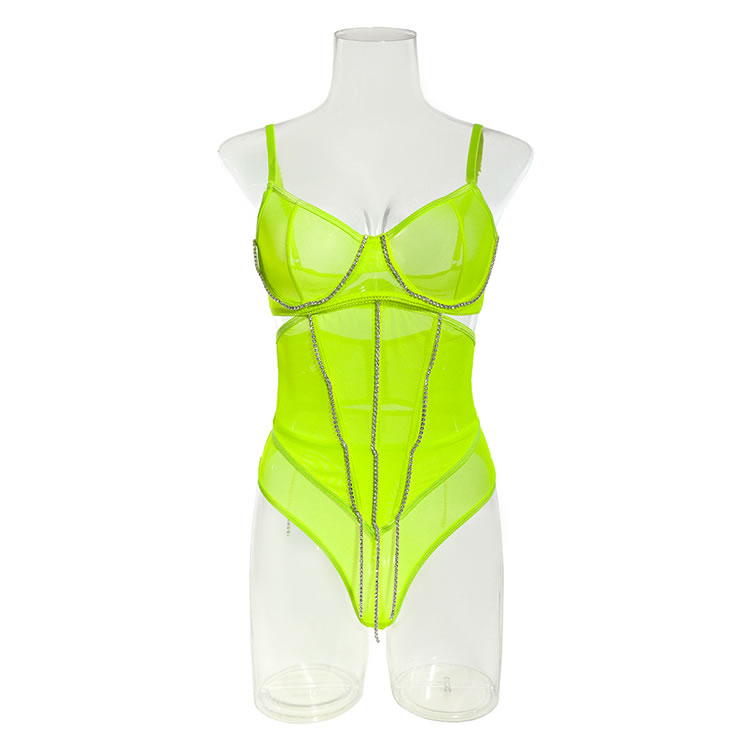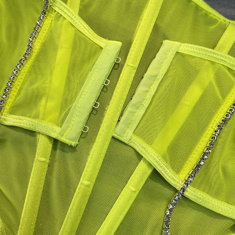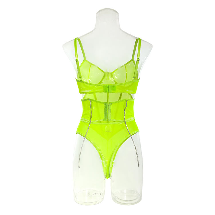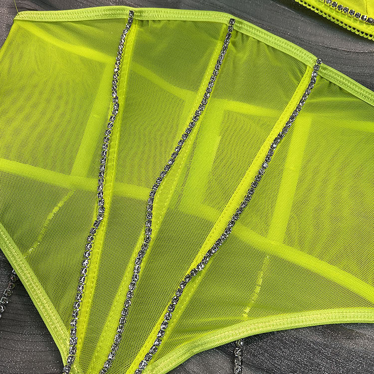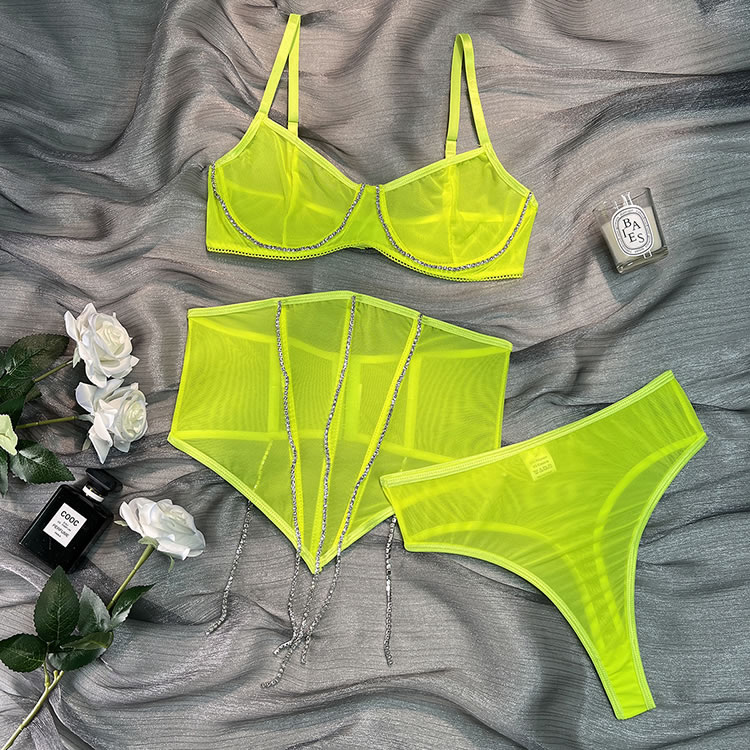 Fulfill midnight dreams in this exclusive bra set featuring underwire sheer mesh cups with a rhinestone trim detailing, adjustable spaghetti straps, a hook and eye back closure, a matching waist cincher with rhinestone accents , a hook and eye back closure, and a matching panty with a cheeky cut back.