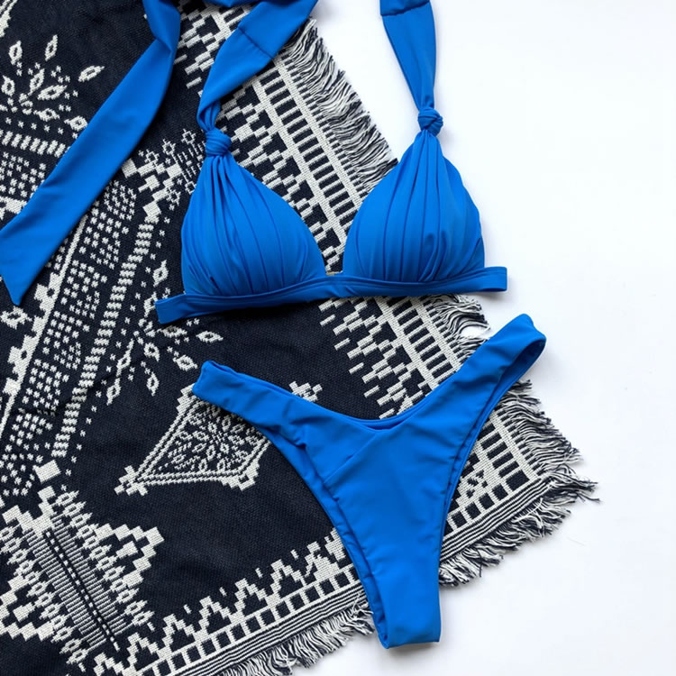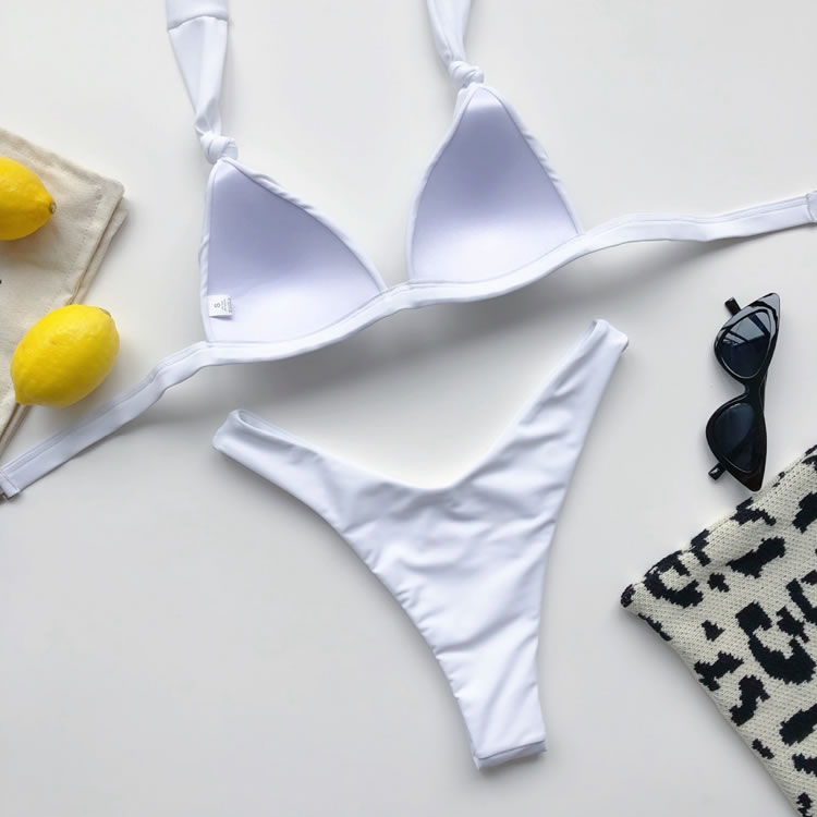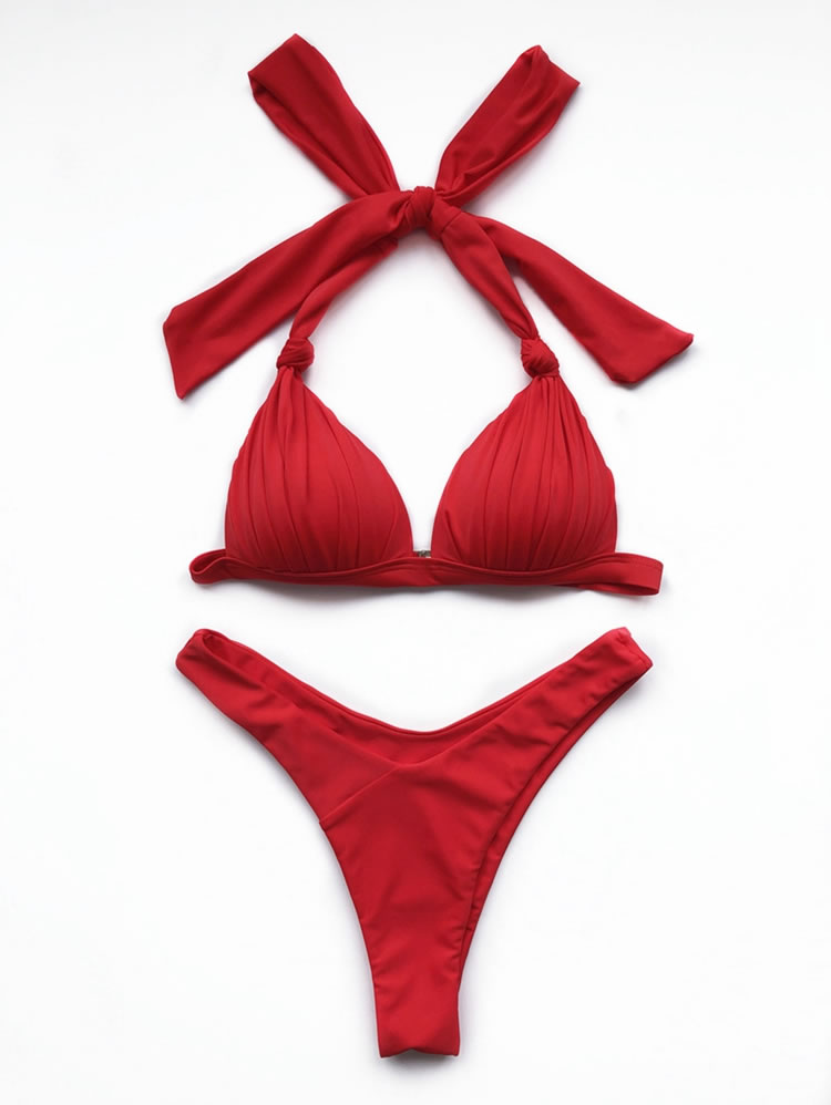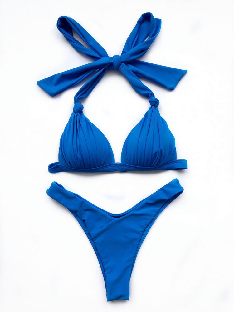 Day dream of sexy summer days in this gorgeous two piece swimsuit featuring triangle cups with long loose halter ties, a hook back closure, and a matching bottom with a cheeky cut back.