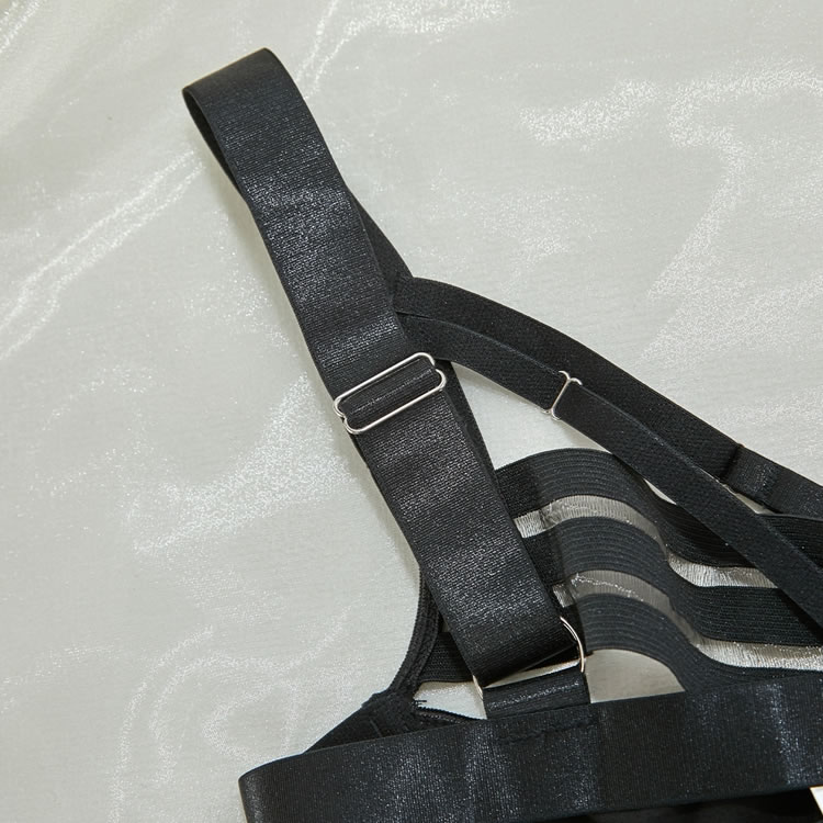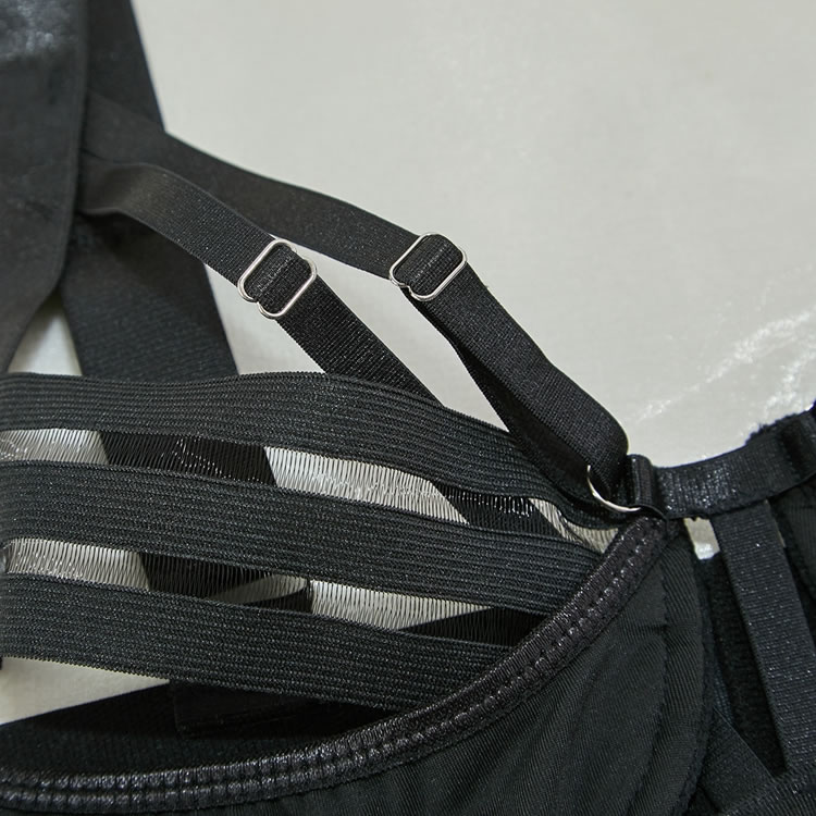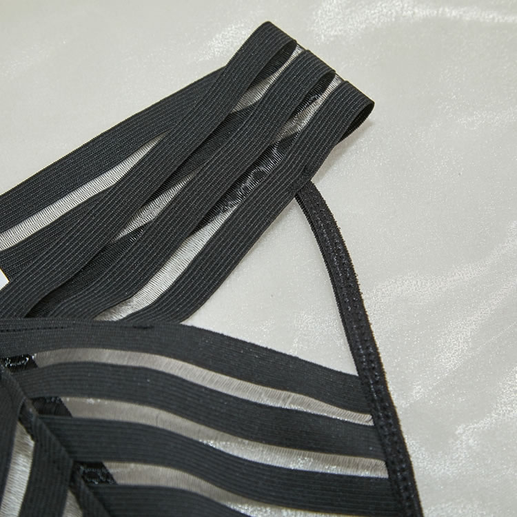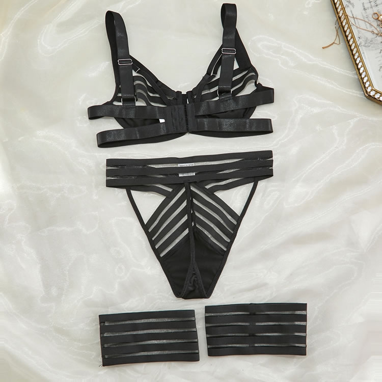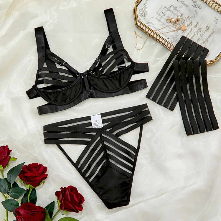 Give your audience a show in this sexy bra set featuring open underwire cups with strappy detailing, adjustable spaghetti straps, a double strapped back band with a hook and eye back closure, and a matching panty with a strappy waistband, and a thong cut back, wraparound leg garters.