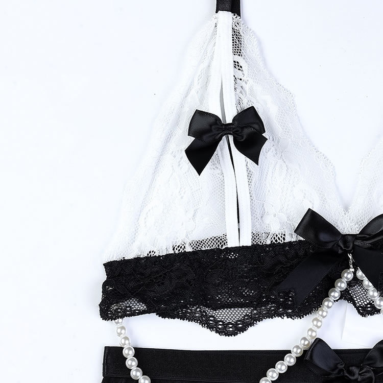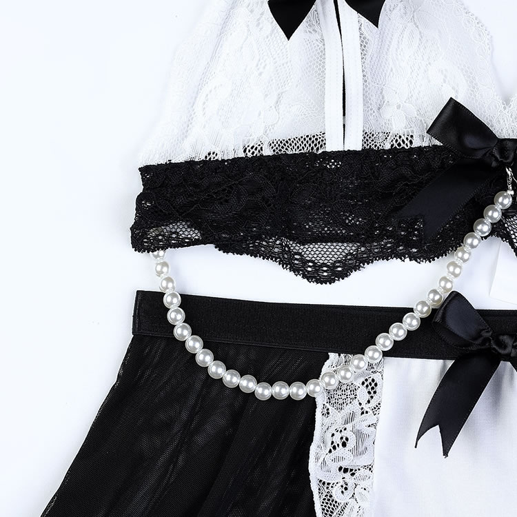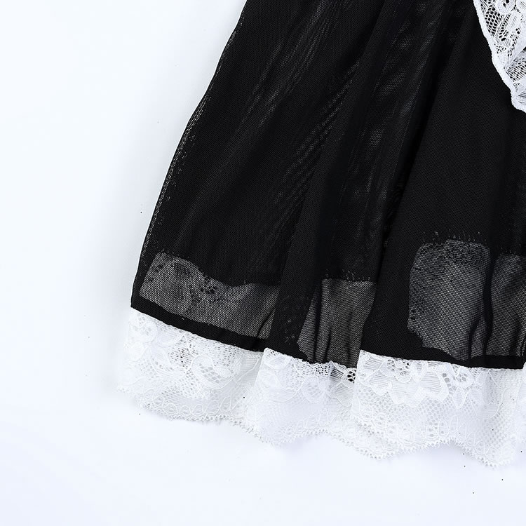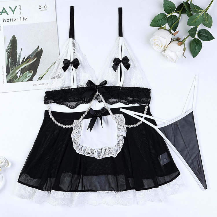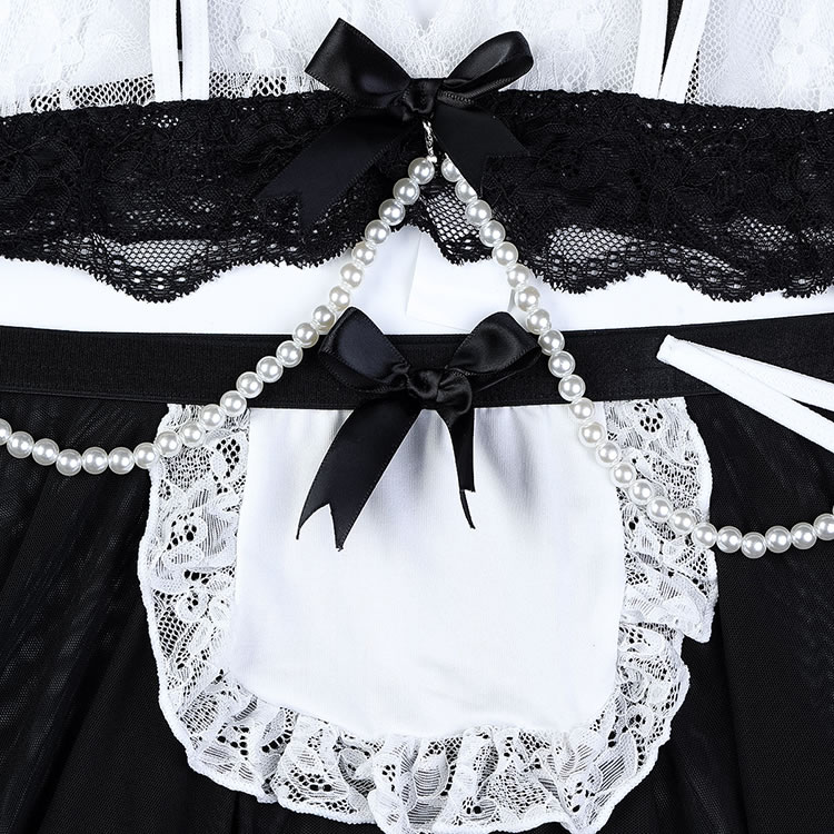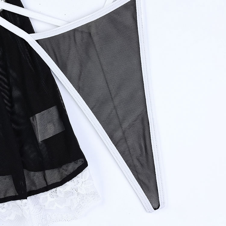 Turn up the heat with this sultry French Maid costume. It features sheer lace cups with tantalizing peek-a-boo details, adjustable spaghetti straps, and a hook back closure. The matching skirt and G-string complete the look, ensuring a flirtatious and playful evening. Perfect for setting the mood and capturing attention.
