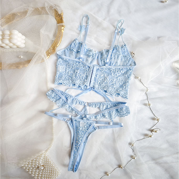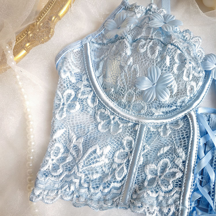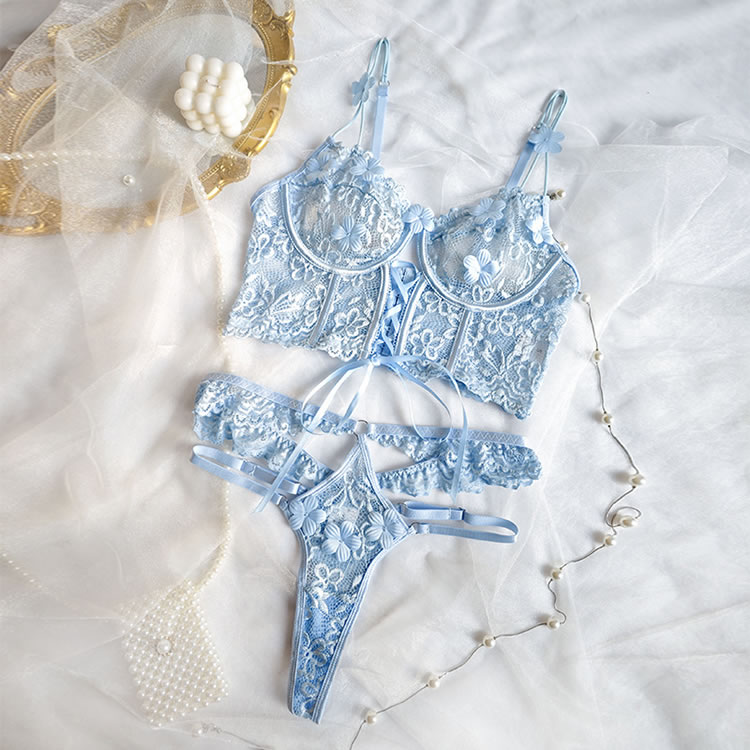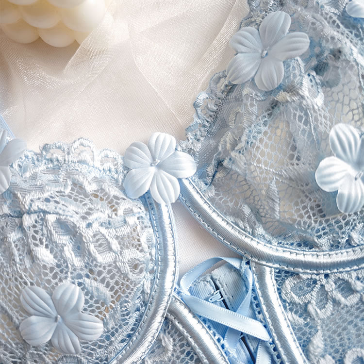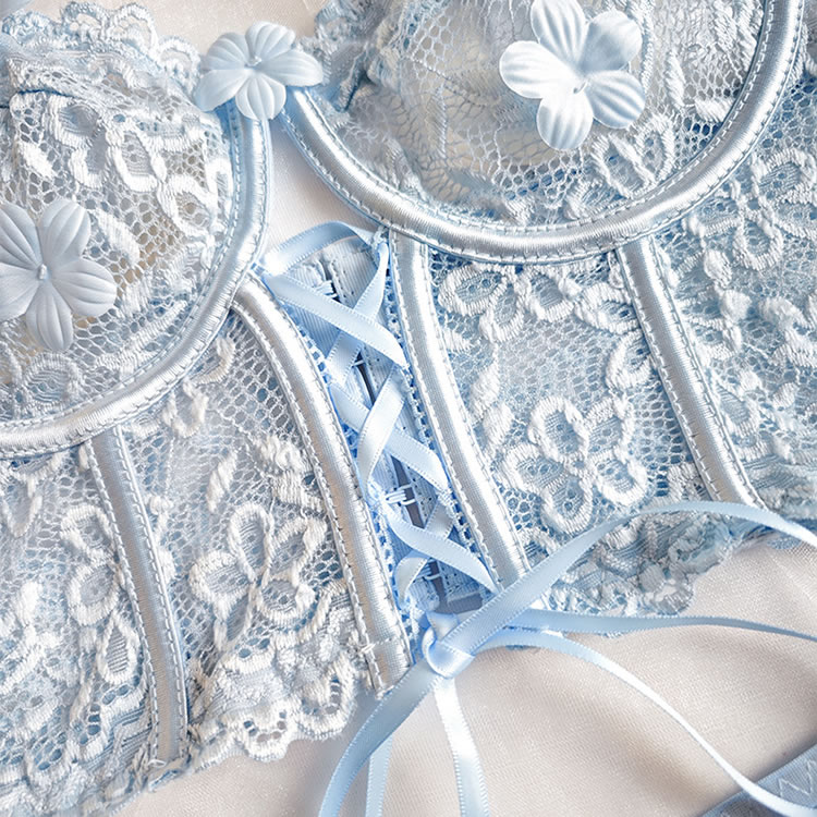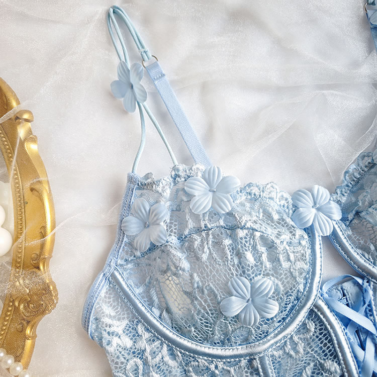 Spoil your sweetheart with this ultra-lovely bra set, featuring sheer lace underwire cups adorned with delicate floral appliqués. The lace underbust band adds a charming touch, while adjustable spaghetti straps and a hook-and-eye back closure ensure a perfect fit. Paired with a matching high-waisted panty, this set is the perfect combination of sweetness and seduction.