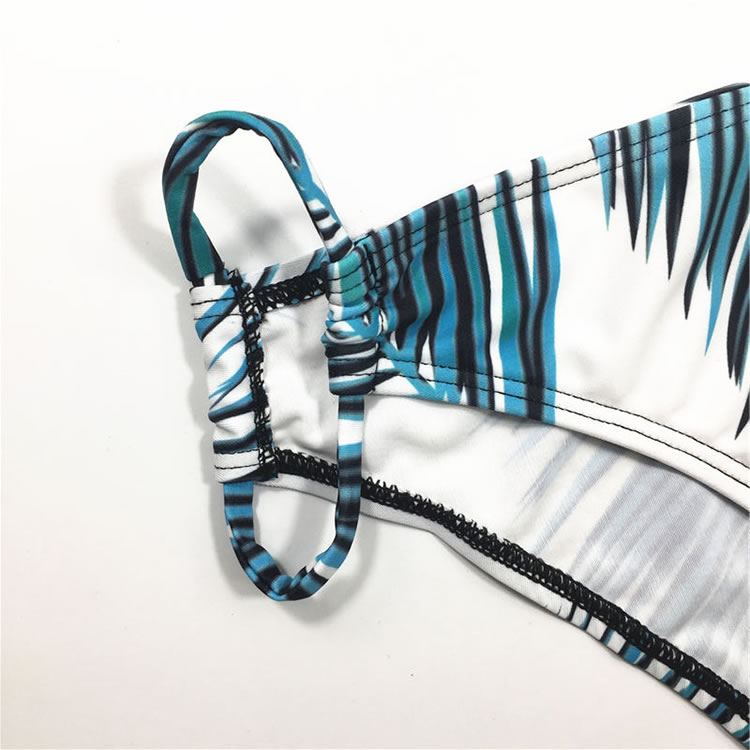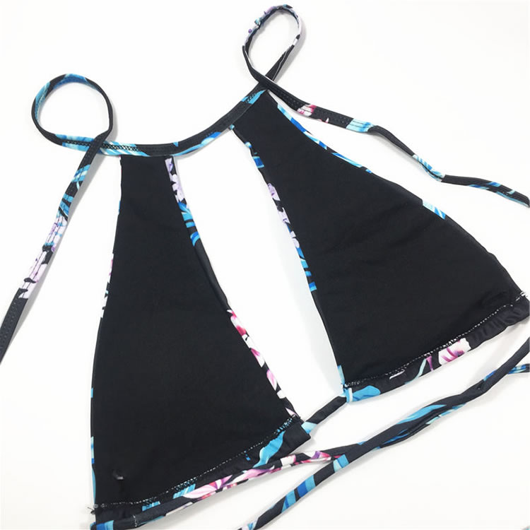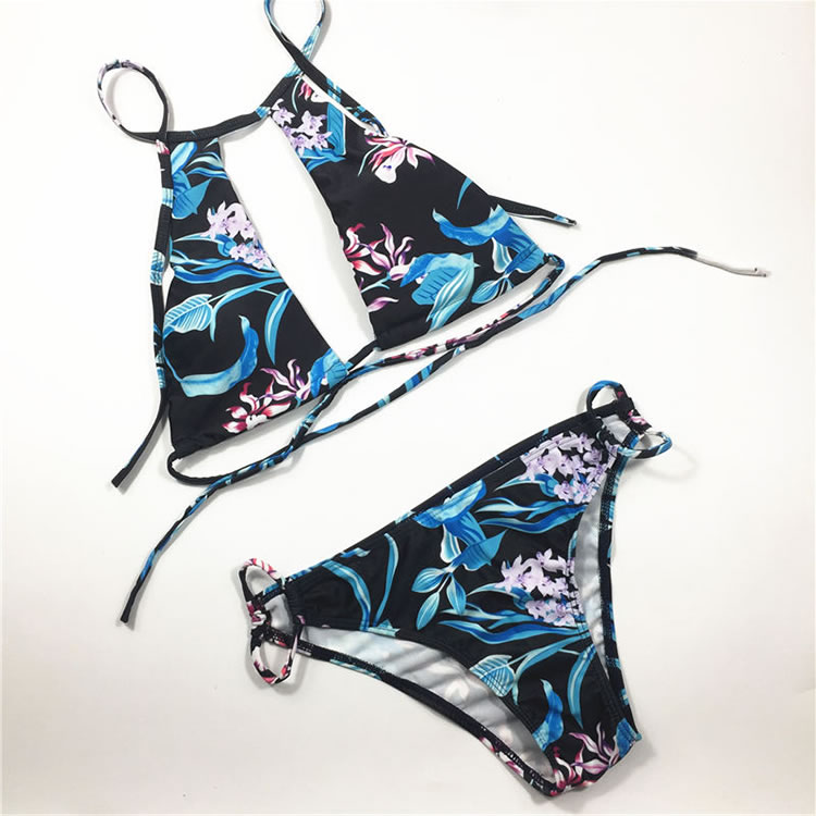 Flaunt your sun kissed curves in this sexy string bikini featuring adjustable triangle cups, halter straps, a tie back closure, an allover palm tree design, and a matching bikini bottom with dual strap sides and a cheeky cut back.