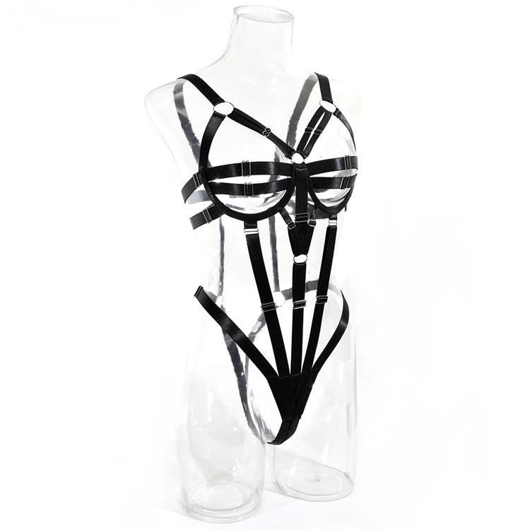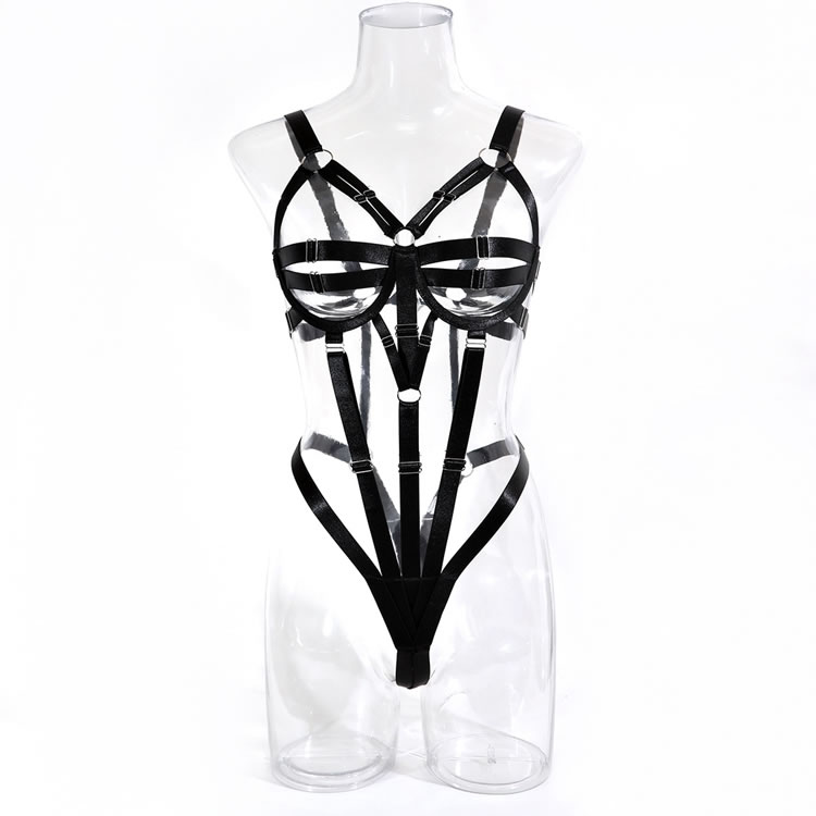 Dare to bare it all for your babe in this stunning teddy featuring adjustable strappy open underwire cups, a strappy open bodice, and a g-string cut back.
