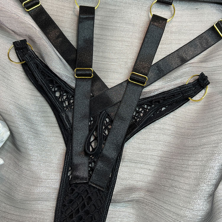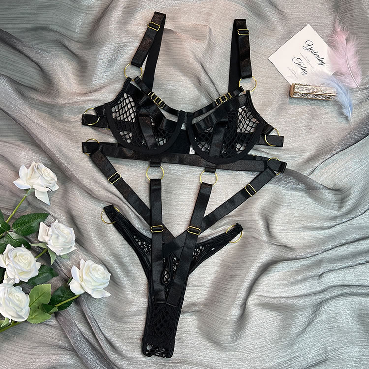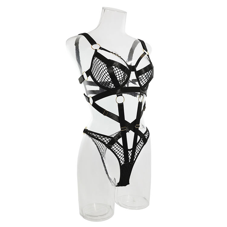 Get ready to stun and amaze in this seductive teddy featuring sheer net underwire cups with strappy detailing, adjustable spaghetti straps, a hook and eye back closure, an open strappy bodice, and a thong cut back.