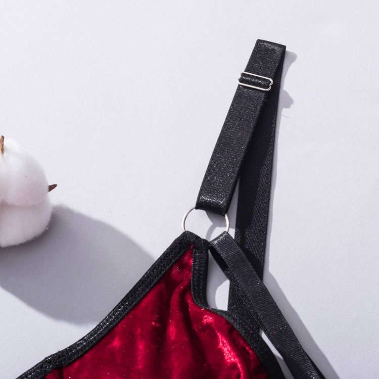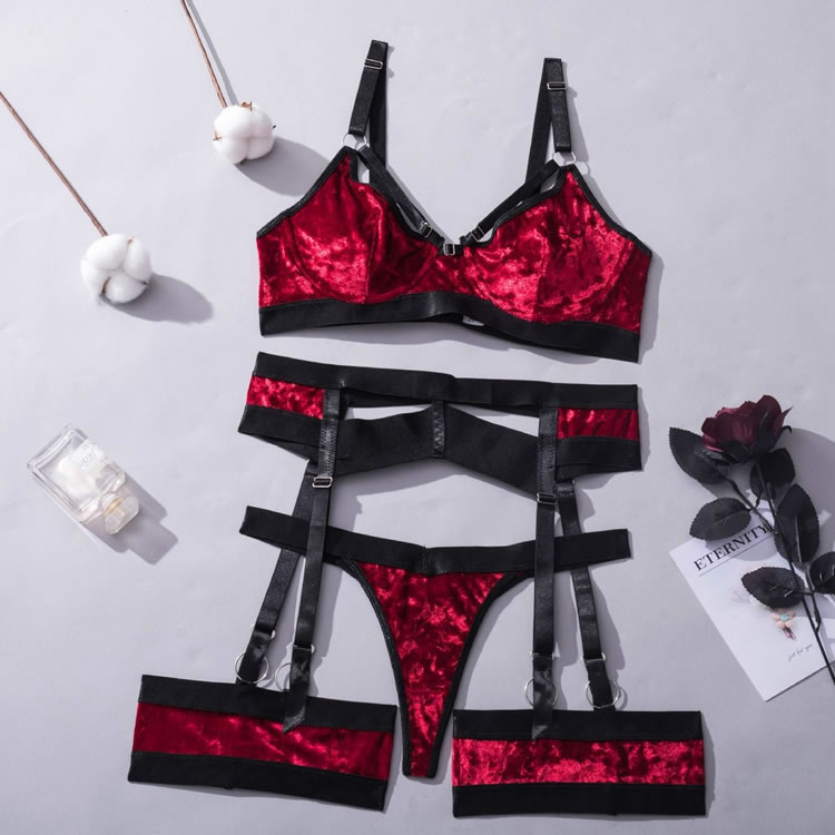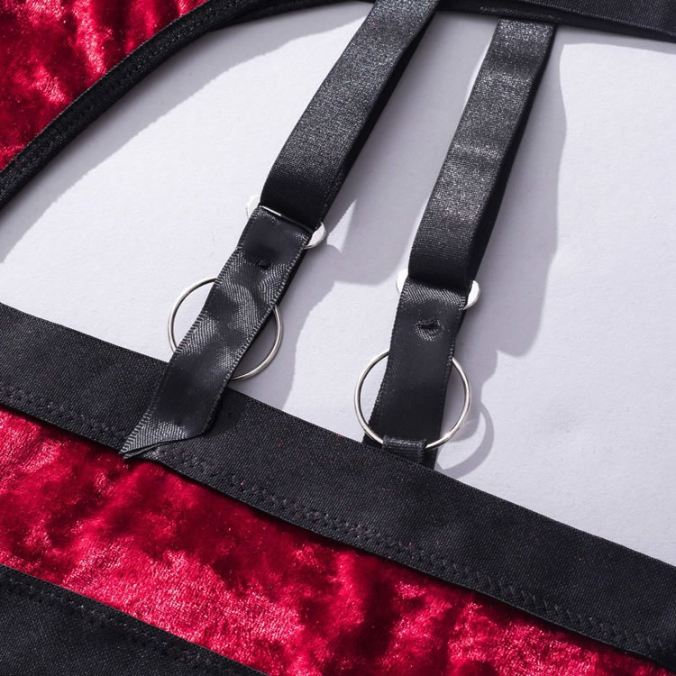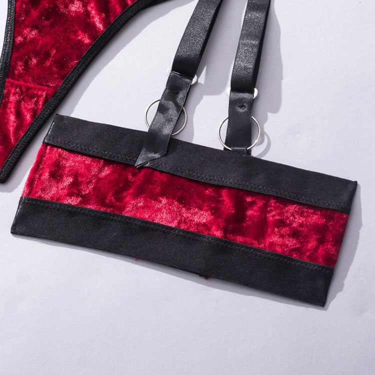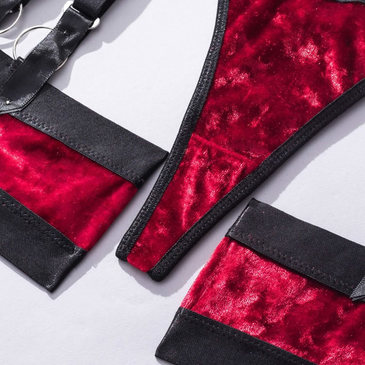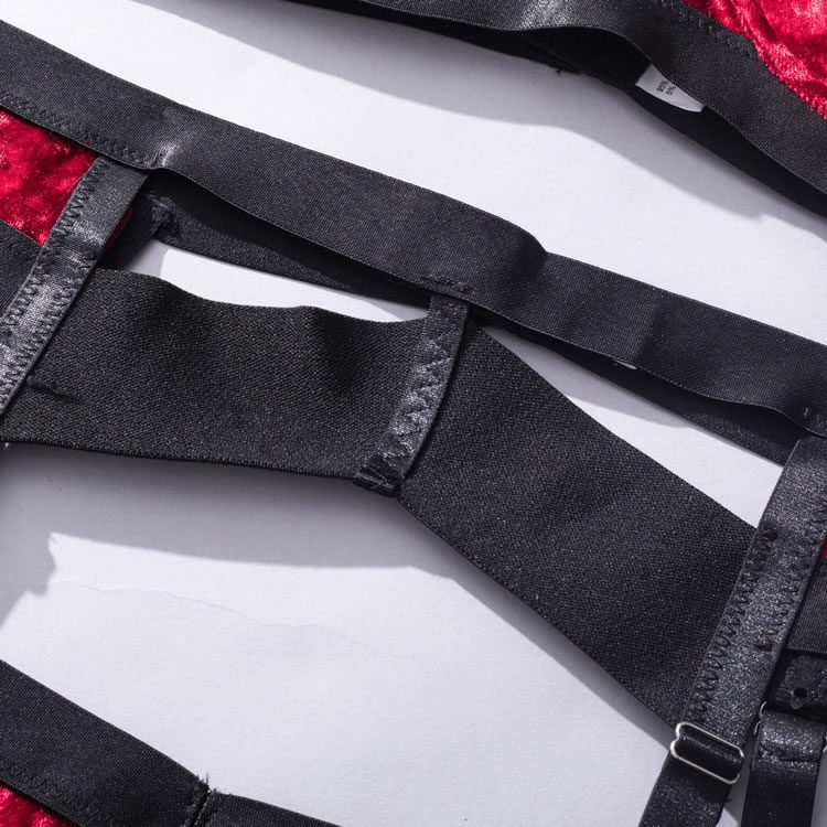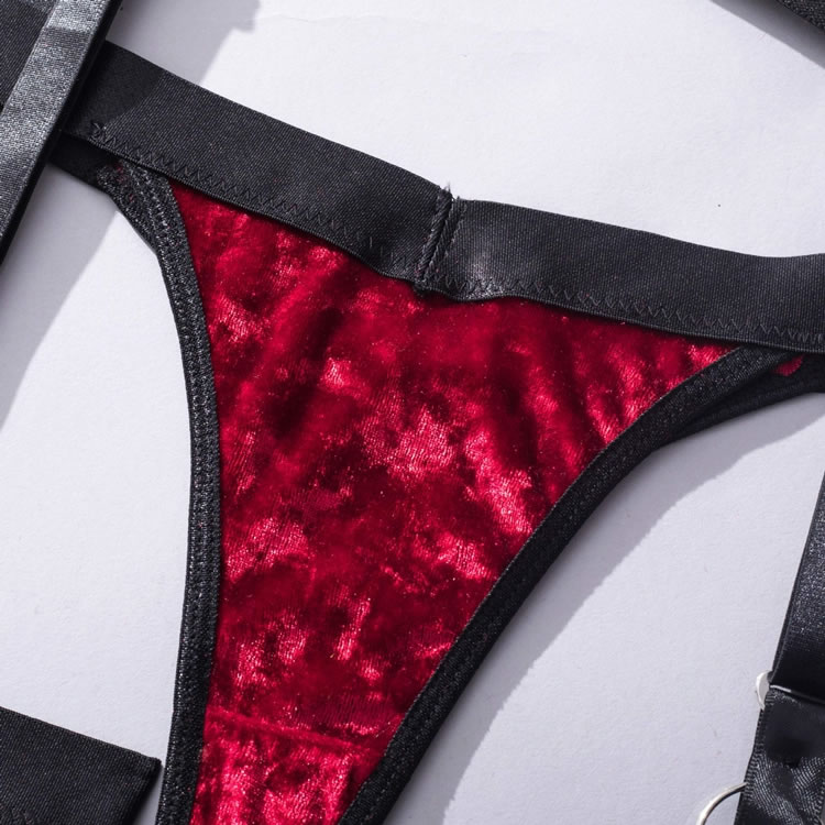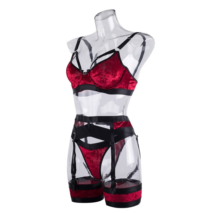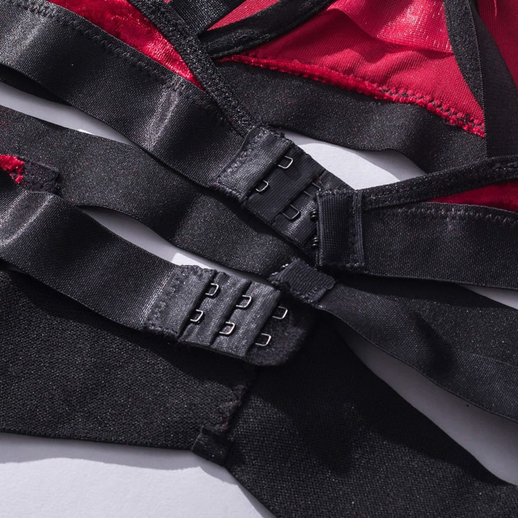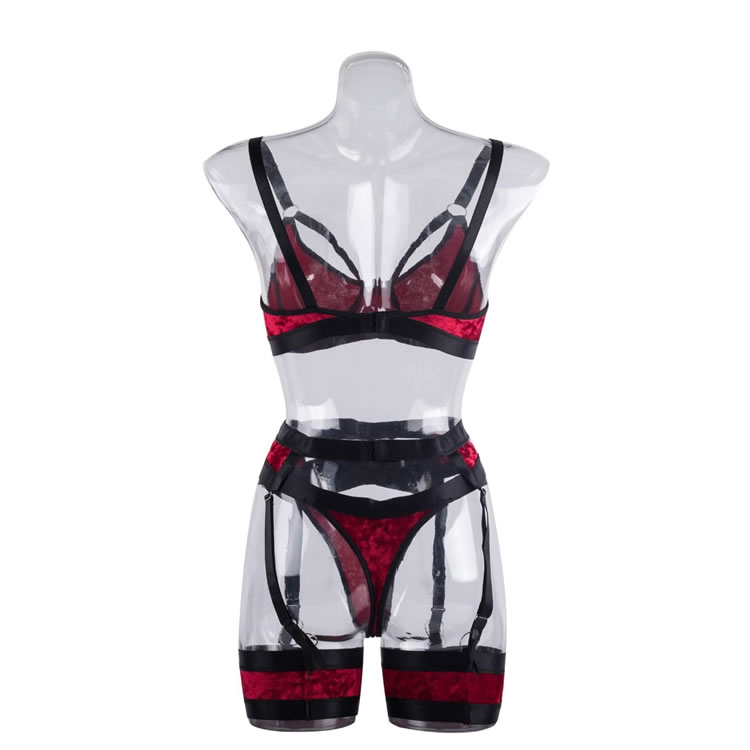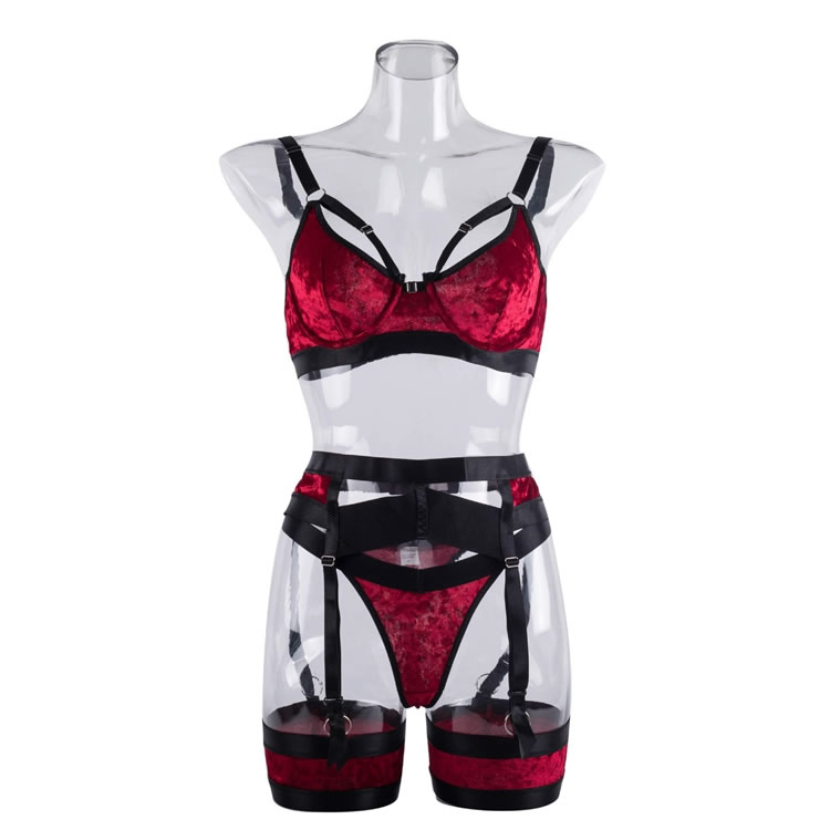 Let your lover's jaw drop in this stunning bra set featuring soft underwire velvet cups with strappy bust detailing, adjustable shoulder straps, a hook and eye back closure, a matching garter belt with djustable garter straps, wraparound leg garters, and matching panty with a thong cut back.
