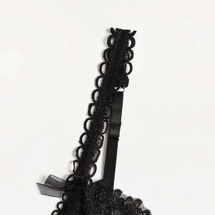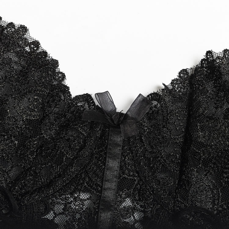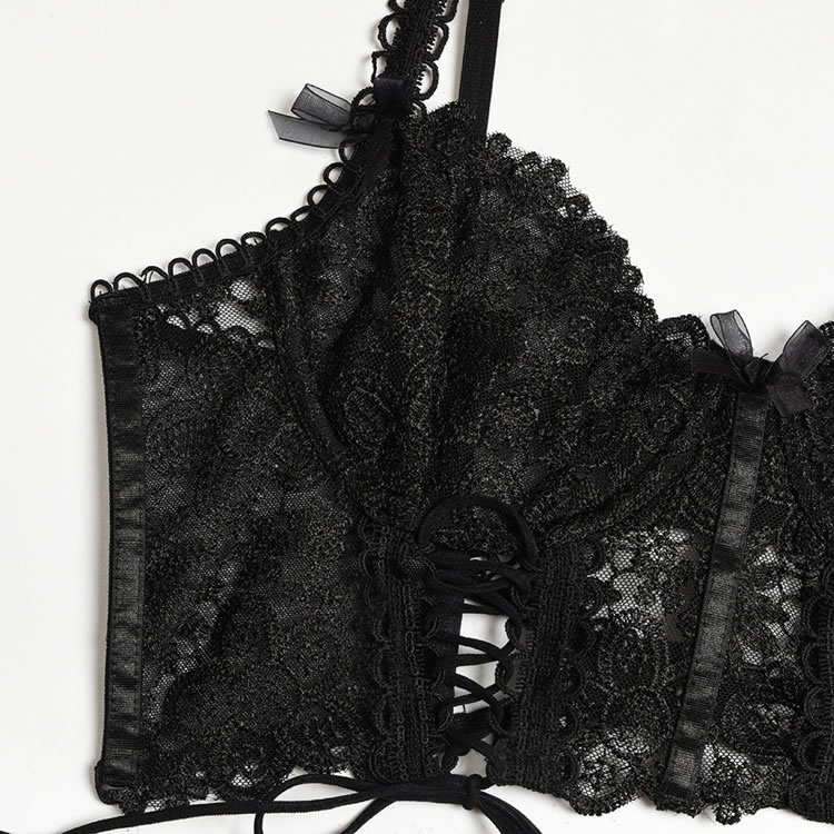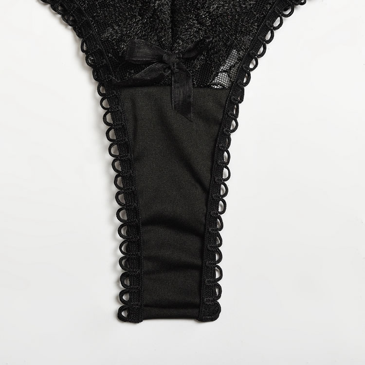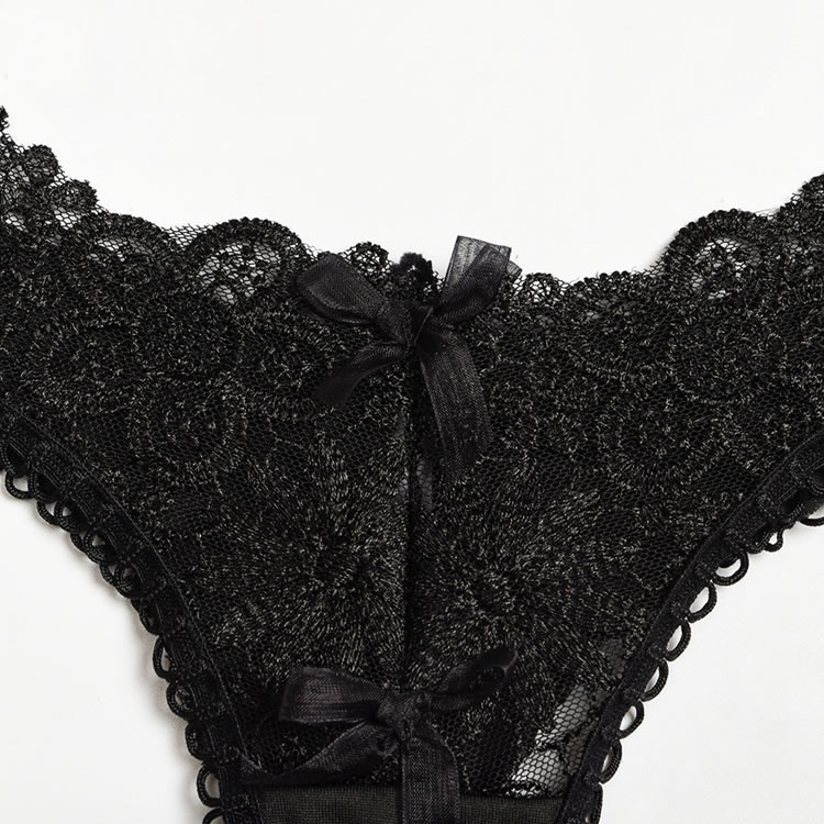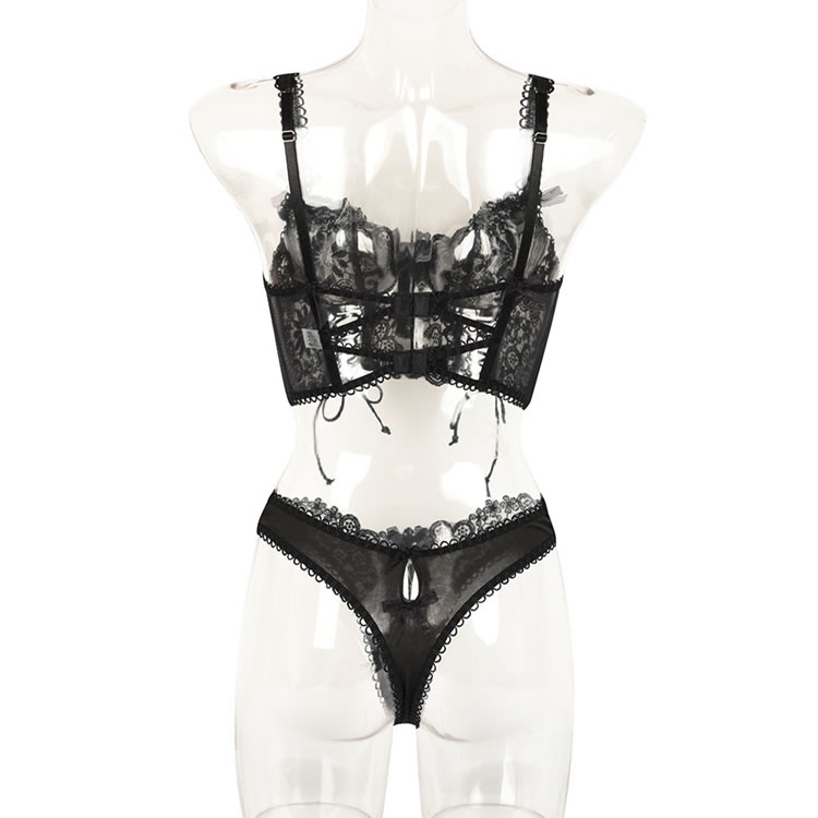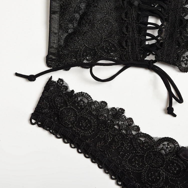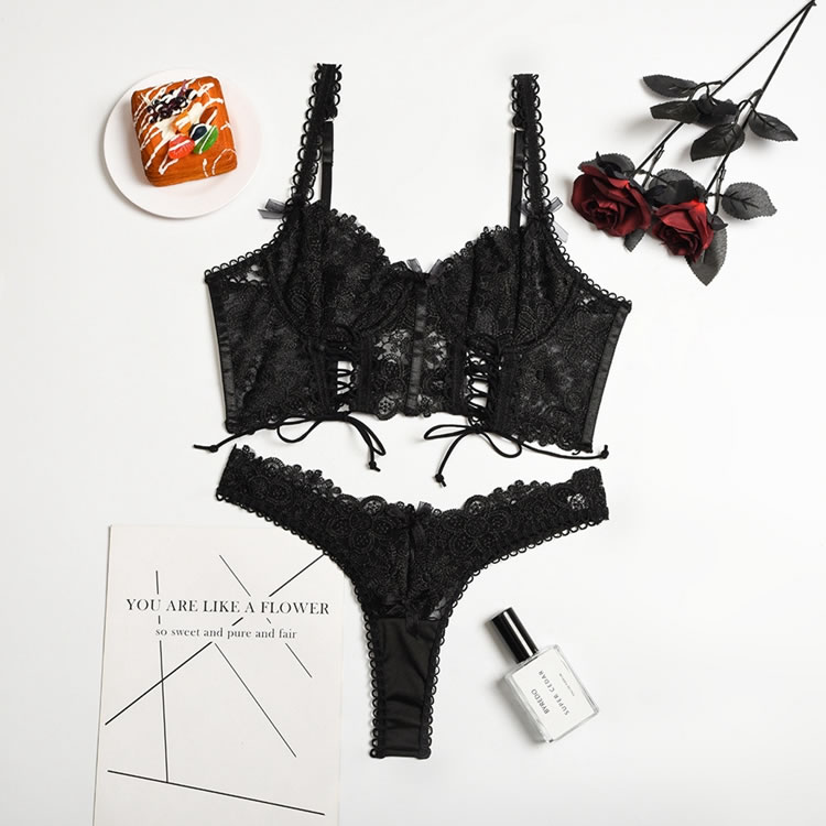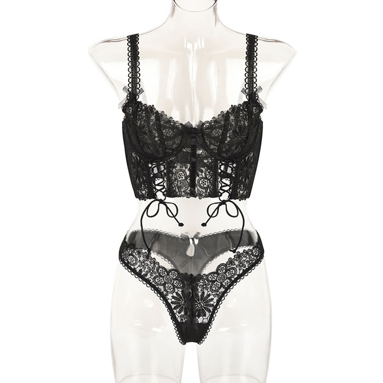 Intrigue your sweetie in this alluring exclusive bra set featuring floral lace underwire cups, a scalloped trim, a lace-up front detail, adjustable spaghetti straps, a hook and eye back closure, and a matching panty with a cheeky cut back.