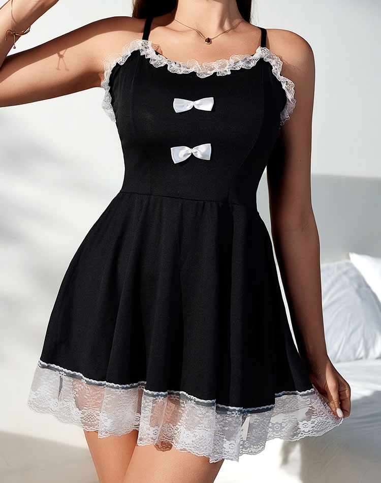 Add a touch of sensual whimsy to your bedroom attire with this flirty babydoll. Available in Black, it features a lace trim, adjustable straps, a satin bow accent, and a solid skirt. Perfect for a night of playful elegance.