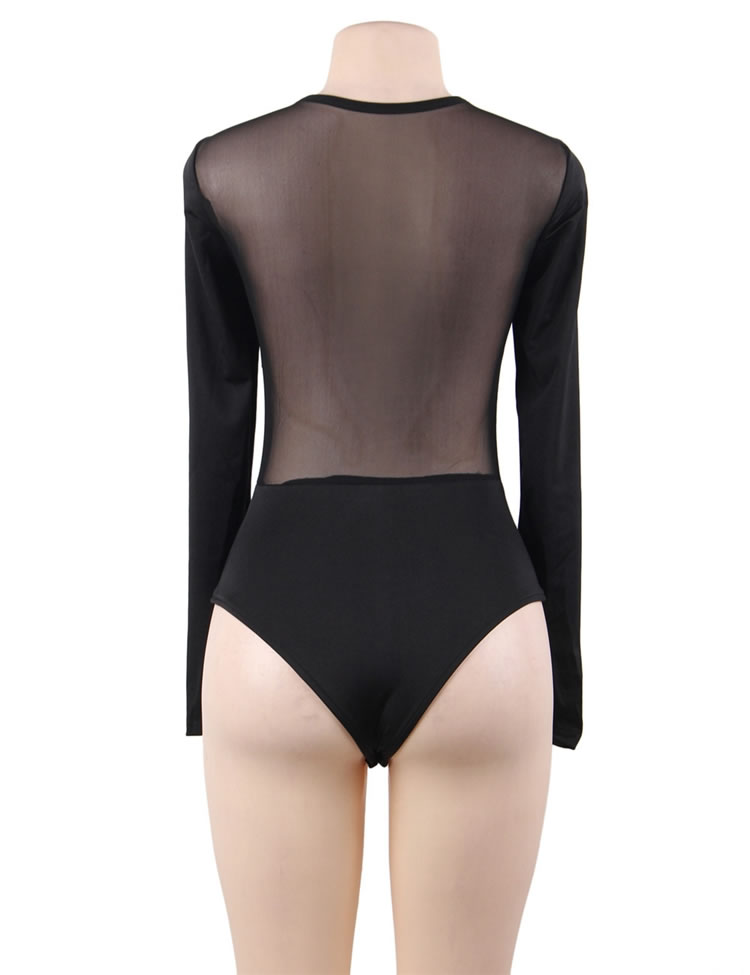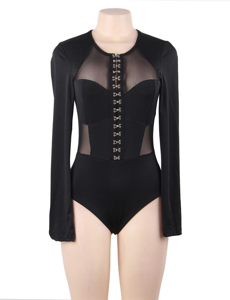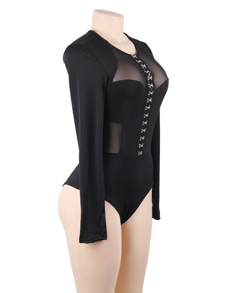 Turn heads in this alluring bodysuit featuring a scoop neckline, a front hook and eye closure, long sleeves, an opaque bottom with high cut sides, a snap crotch, and a cheeky cut back.