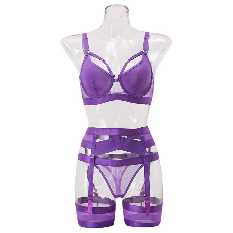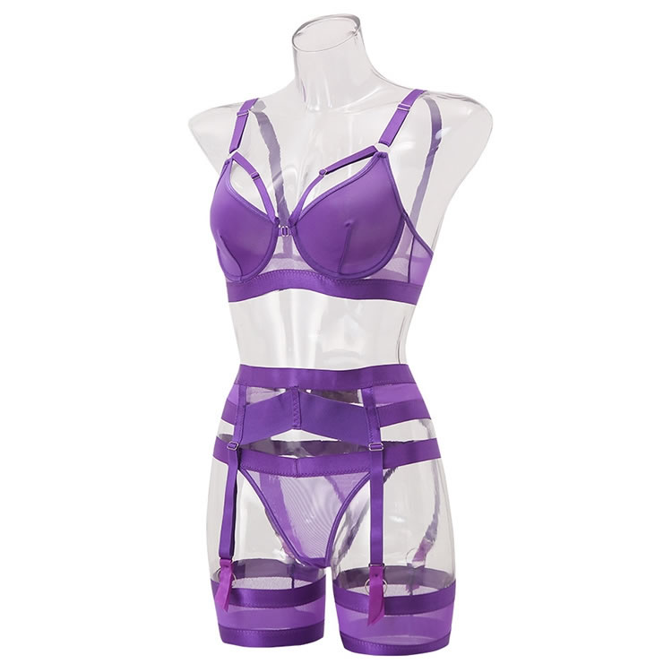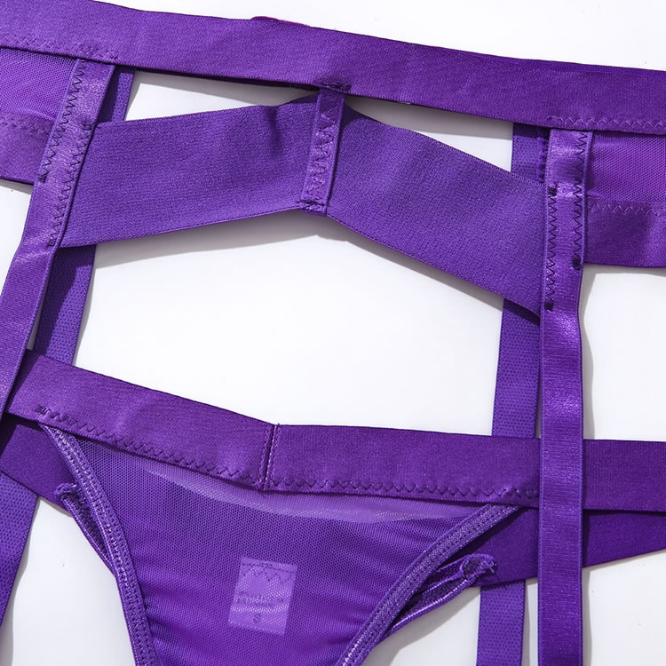 Make a mark on your babe in this stunning bra set featuring soft underwire cups with strappy details, adjustable spaghetti straps, a hook and eye back closure, a high waisted strappy garter belt with adjustable garters, wraparound leg garters, and a matching panty.