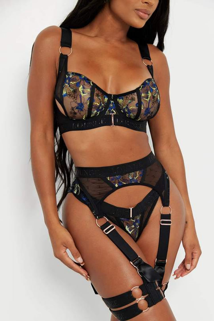 Show your sweetie who's in charge in this ultra sexy bra set featuring sheer lace underwire cups, adjustable spaghetti straps, a hook and eye back closure, a high waisted garter belt with adjustable garters, wraparound leg garters, and a matching panty.