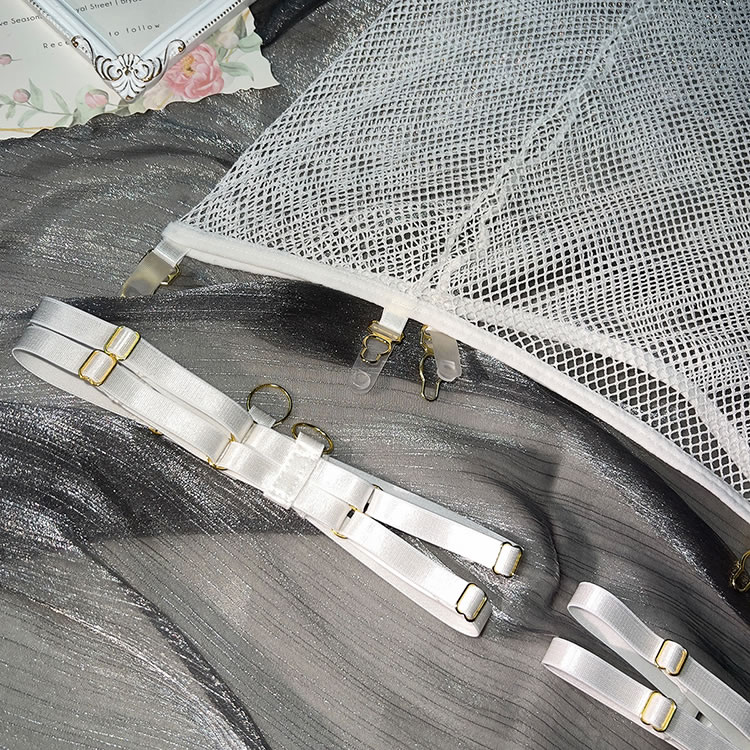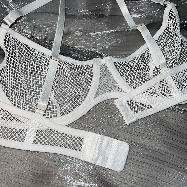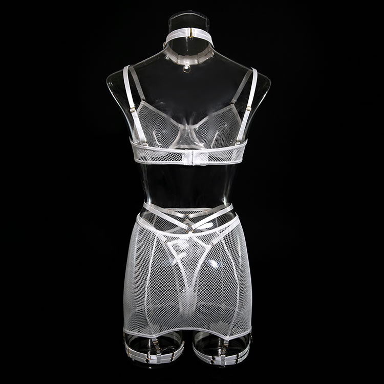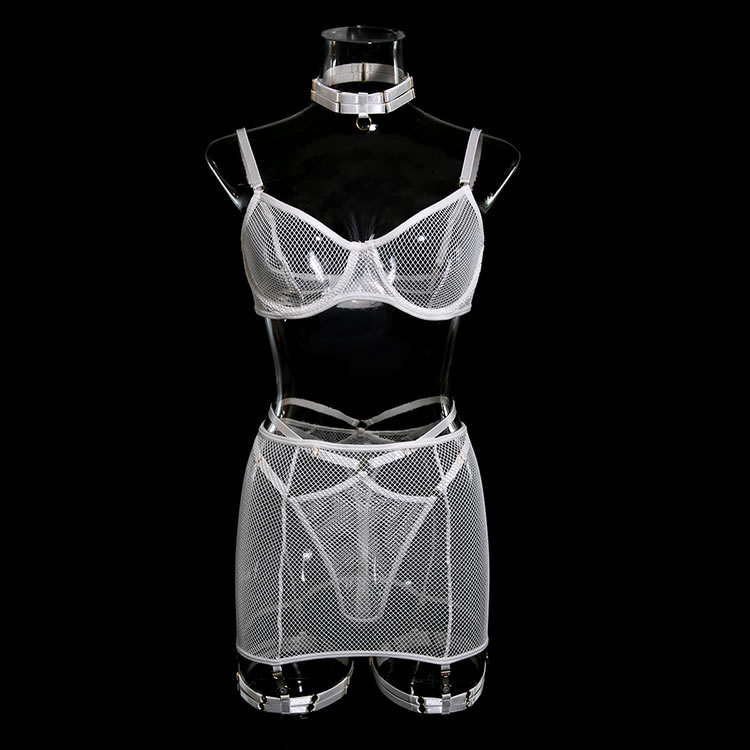 Show some high class attitude in this sexy bra set featuring sheer mesh underwire cups, adjustable shoulder straps, a hook and eye back closure, a matching garter skirt with garter straps, wraparound leg garters, a choker, and a matching panty with a thong cut back.