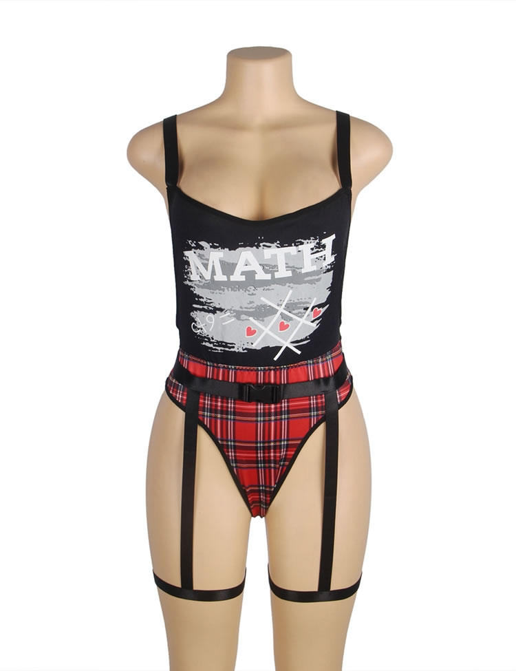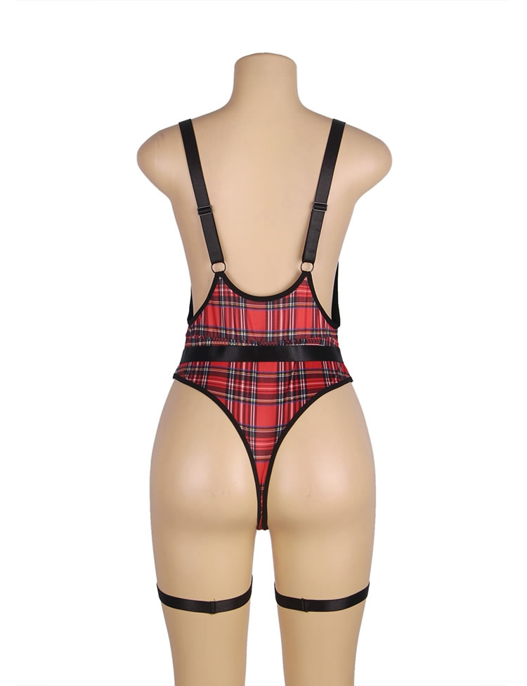 Double Shoulder Straps Red Plaid Bodysuit Costume with Wait Belt