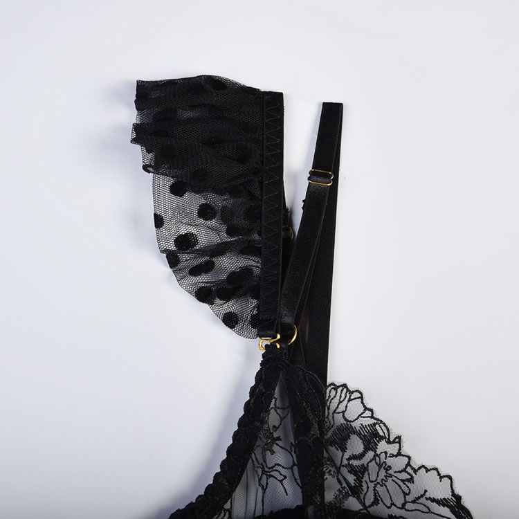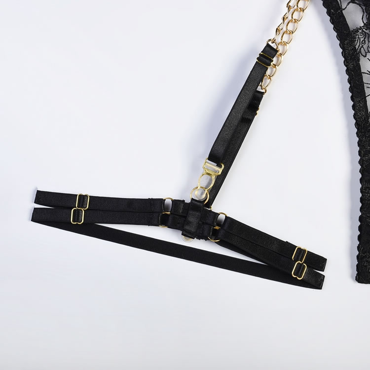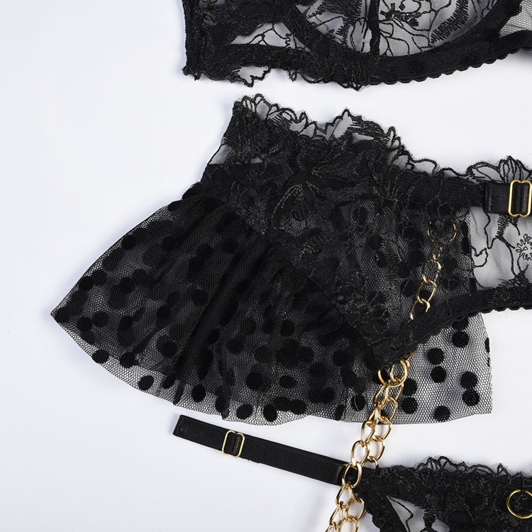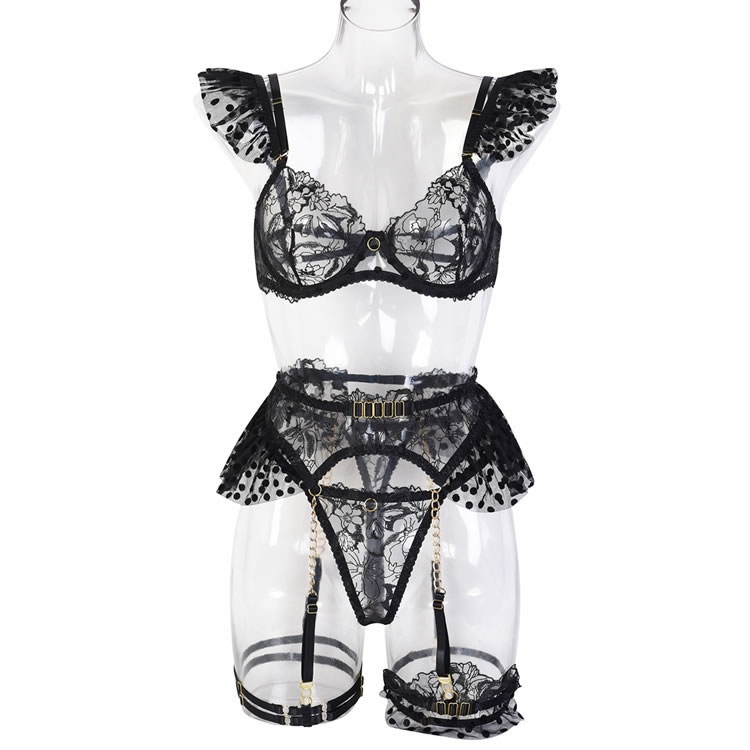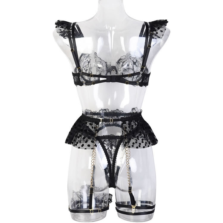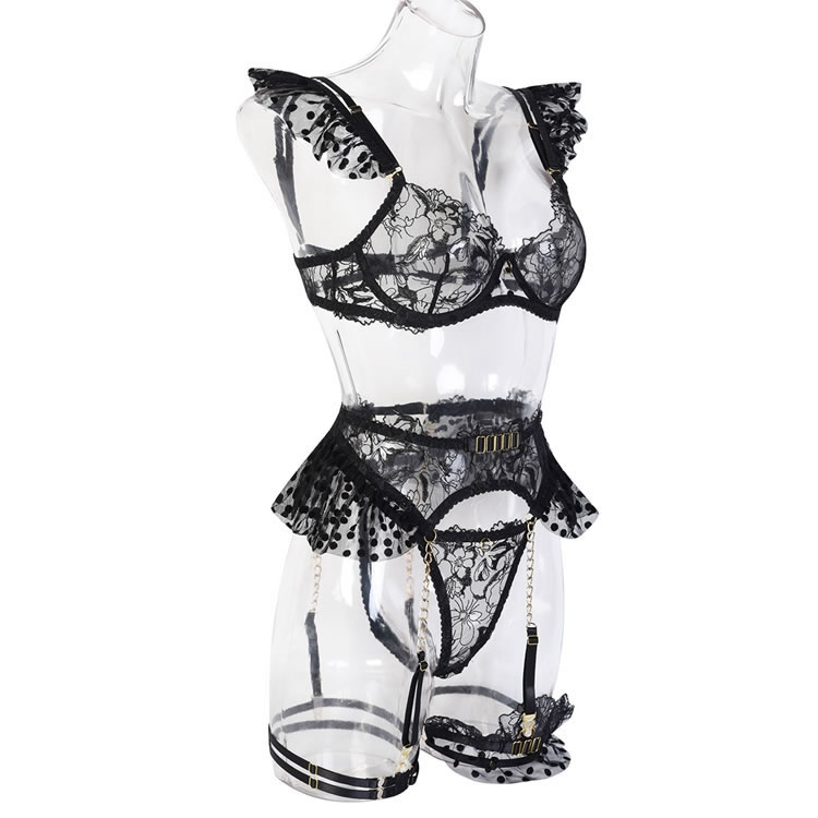 This elegant bra set features sheer underwire cups, adjustable spaghetti straps, a hook and eye back closure, a matching garter belt with adjustable garter straps, wraparound leg garters and a matching panty.